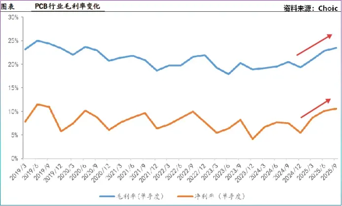 从下图变动趋势上不难发现,进入2025年,PCB行业毛利率和净利率出现同步抬升,毛利率上行至25%,净利率突破10%。