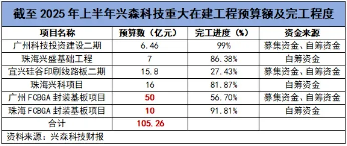 截至2025年上半年,兴森科技共有六大重要在建工程,总预算投资额高达105.26亿元,是其2024年总营收的1.81倍,可谓是大手笔。