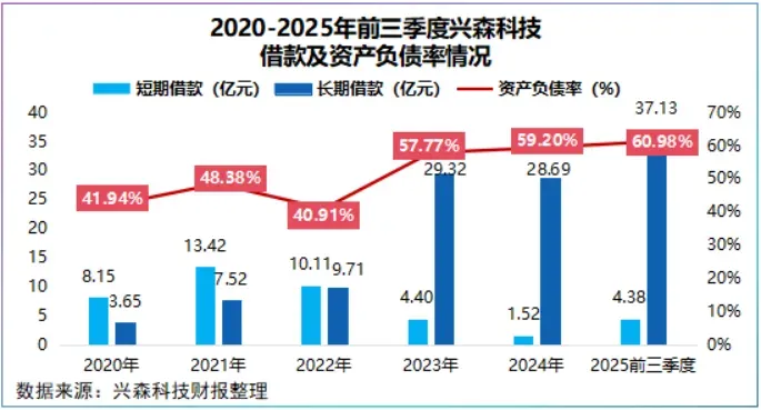 截至2025年前三季度,公司长期借款为37.13亿元,短期借款同比激增207.44%,达到4.38亿元,资产负债率为60.98%。
