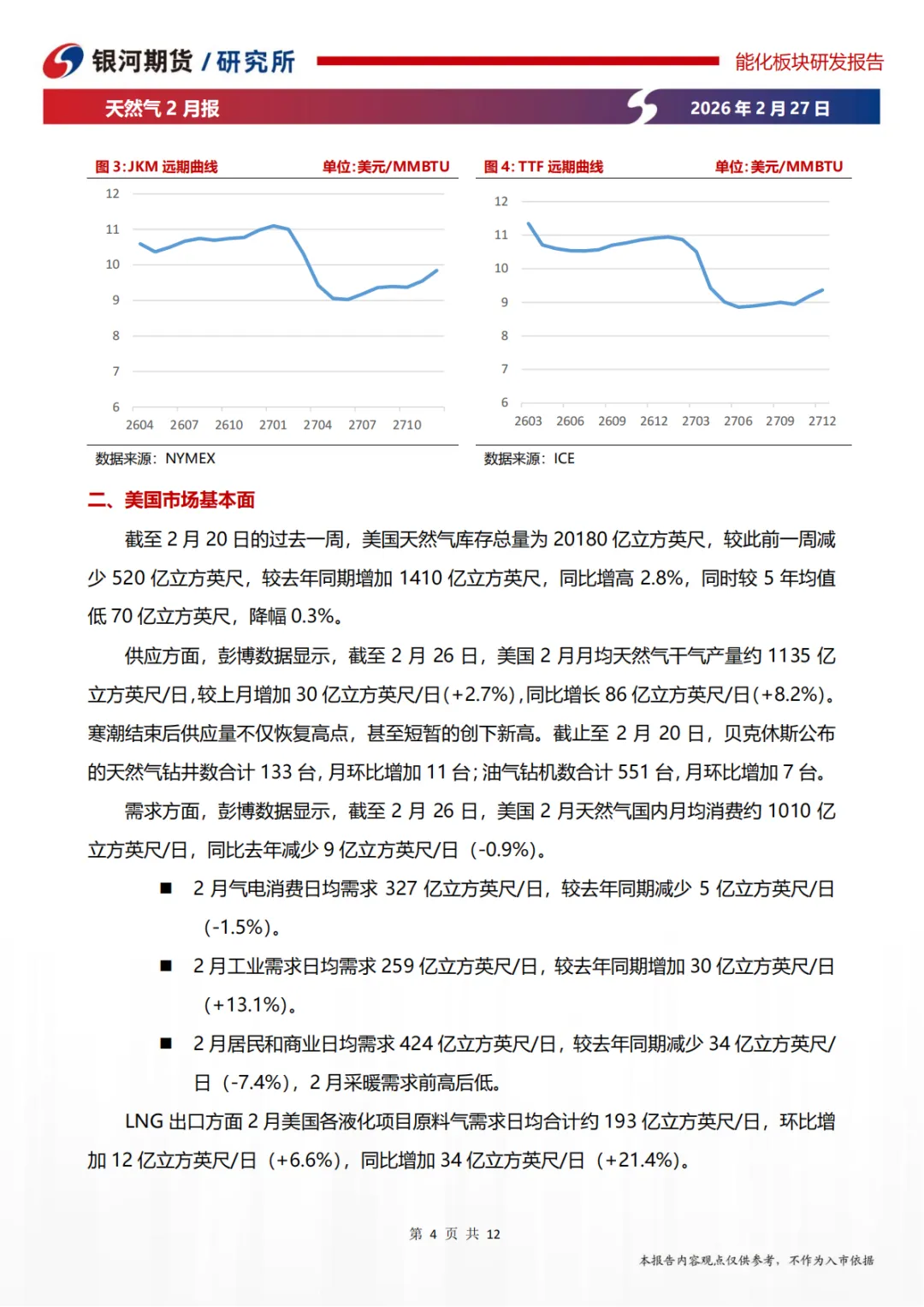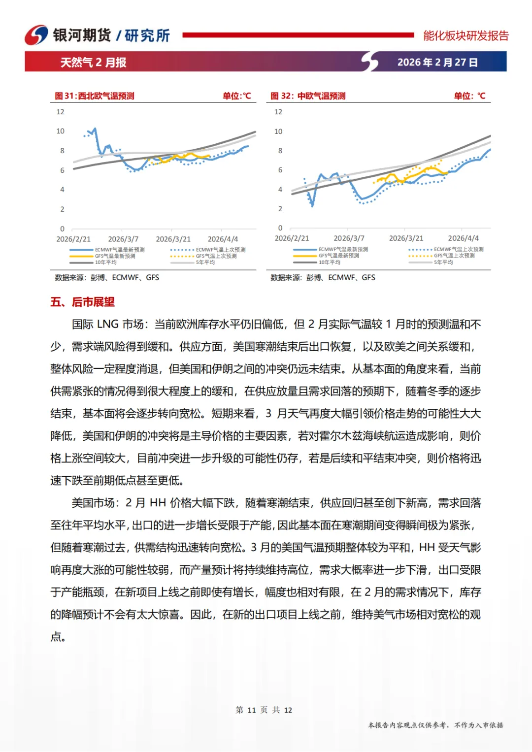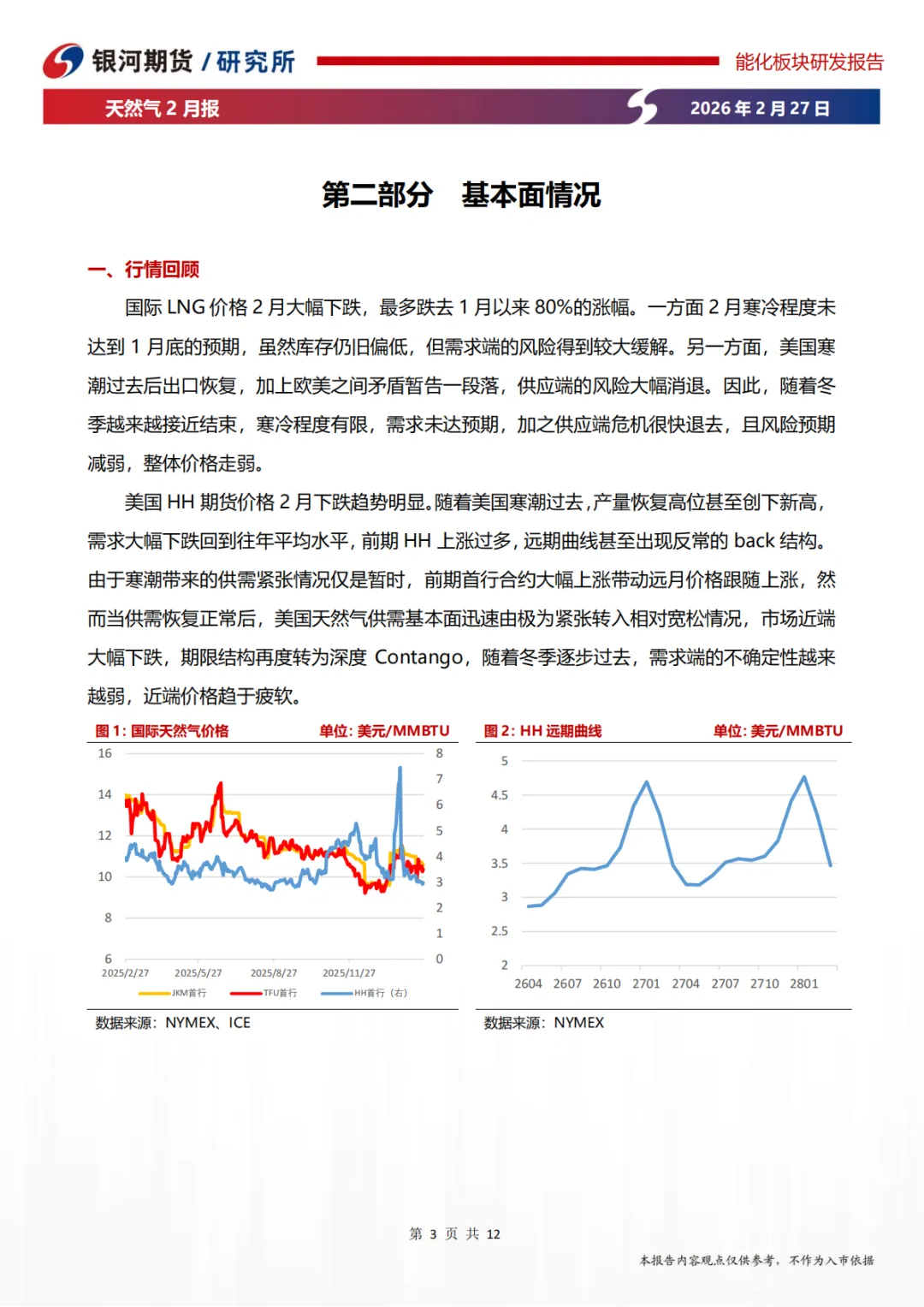 美国HH市场:预计3月气温平和,天气驱动价格上涨的可能性小。在产量维持高位、需求季节性下滑、出口增长受产能限制的背景下,报告维持美国天然气市场相对宽松的观点。