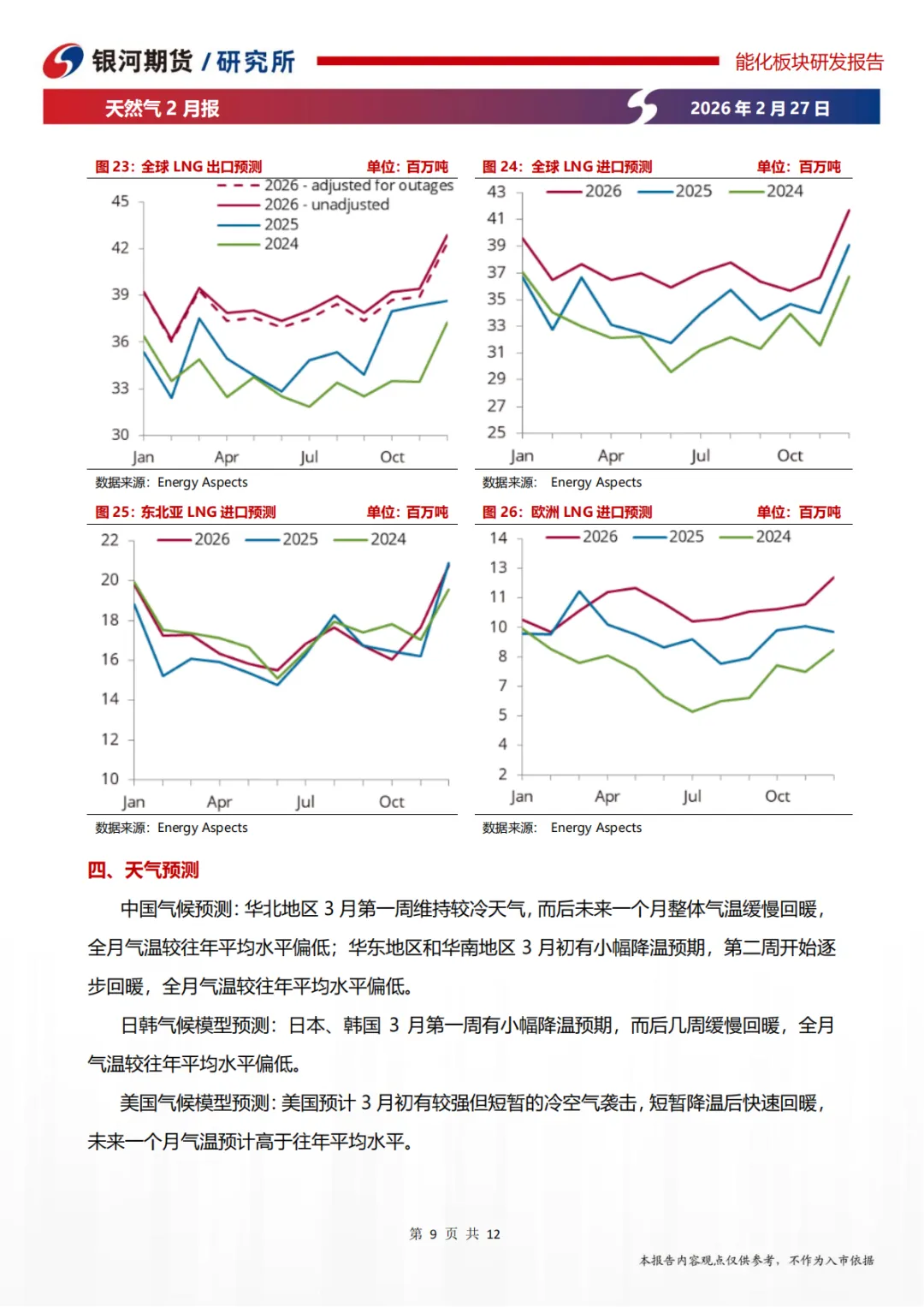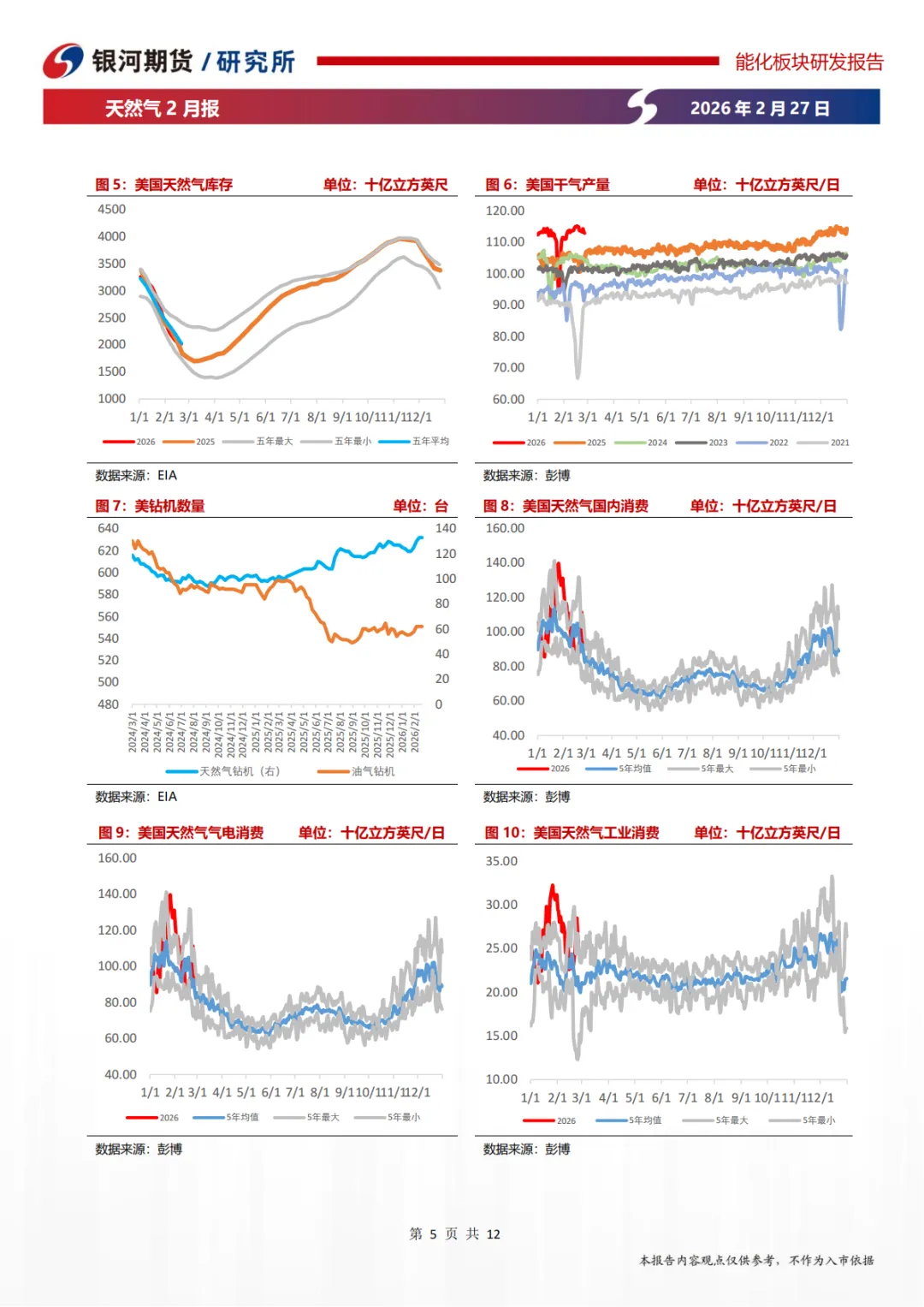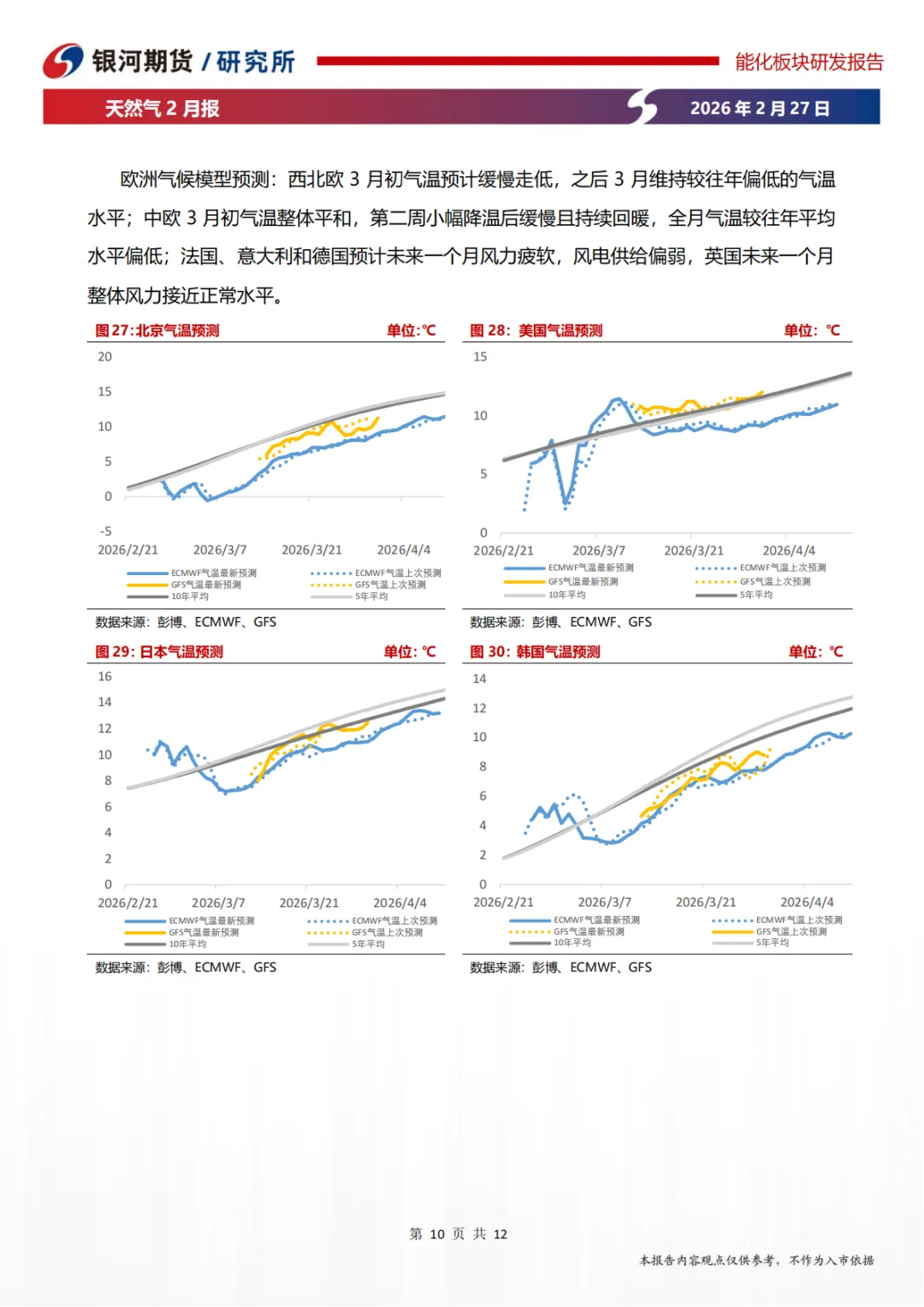 美国HH市场:预计3月气温平和,天气驱动价格上涨的可能性小。在产量维持高位、需求季节性下滑、出口增长受产能限制的背景下,报告维持美国天然气市场相对宽松的观点。