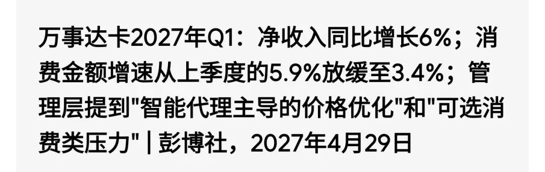 万事达卡2027年一季度财报,是事态的“不可回头点”。美国运通(AXP)遭受的打击最大:一方面白领裁员蚕食其高净值客户群,另一方面智能体绕过刷卡费用,直接刺穿其收入模型。Synchrony、Capital One、Discover在接下来几周内均暴跌超10%。