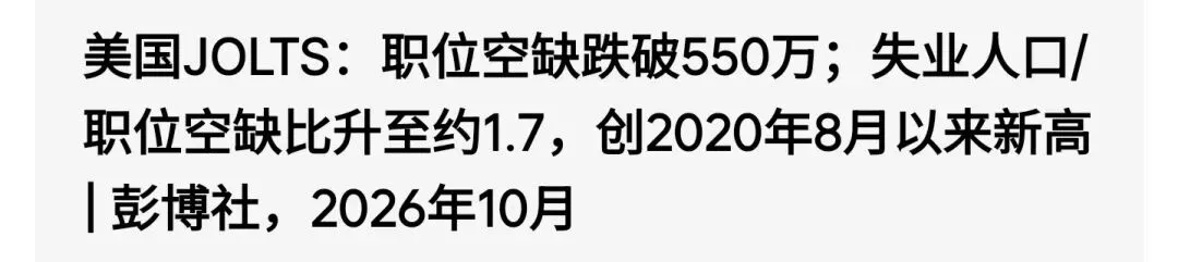 招聘率全年低迷,但2026年10月的JOLTS数据提供了明确信号:职位空缺跌破550万,同比下降15%。