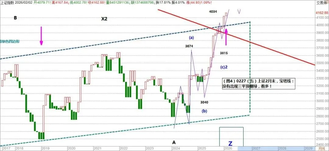 墨绿色四边形的上线也突破了二个月,2月的下影线正好碰触回抽四边形上线。