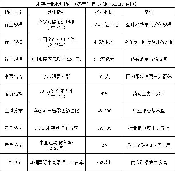 脱离数据谈行业,都是纸上谈兵。服装行业的所有数据,本质都是“消费需求”和“转化效率”的较量,把这些基础数据拆解开,就能清楚看到行业的增长机会和风险。现在的服装行业,早就不只是“卖衣服”这么简单,而是拉动消费的重要力量:2025年中国服装零售额达2.8万亿元,看似规模不算特别大,但全产业链产值达4.5万亿元,其中间接产值(面料、设备、物流、宣传等)1.1万亿元,带动的外溢产值(配饰、文旅、直播、穿搭培训等)1.6万亿元,外溢产值占比超35%。“一个爆款带火一个品类”“一个品牌带火一个产业集群”,在行业里很常见:波司登走高端化,带动了羽绒服面料产业发展;草本初色爆火,推动了贴身内衣供应链升级,服装已经成为连接消费和制造业的重要纽带。消费端的特点很明确:消费基数稳定,结构有差异,消费者更理性、更注重品质。核心消费人群有6亿人,2025年消费人次同比增长18.2%;30-39岁人群占比42%,是消费主力,而24岁以下年轻人占比只有18%,比2019年大幅下降,因为他们的注意力被短剧、潮玩等其他领域分流了。行业被迫升级,服装平均单价只涨了2.1%,高性价比、科技面料、穿着舒适,成为核心竞争力。区域分布上,广东、浙江、江苏三省的零售额占比达48.3%,是行业的核心基本盘;下沉市场是主要增长来源,二线城市零售额占比36.7%,四线城市占比31.2%,增速比一线城市高11.5个百分点,平价运动装、家居服等接地气的品类,在下沉市场潜力很大。这也能看出,国内服装市场还是以服务中低消费群体、贴合本地需求为主。行业竞争呈现明显的梯队差异:安踏体育、波司登属于千亿级第一梯队,靠着全产业链优势,占据行业主导地位;李宁、森马服饰等属于百亿级第二梯队,靠多品类布局稳住市场份额;中小品牌、设计师品牌则聚焦细分赛道,抢占第三梯队。目前,TOP10服装品牌合计占据58.7%的市场份额,供应链端的集中度更高,申洲国际一家就占据了中高端代工市场70%以上的份额;零售端则是线上线下结合的趋势,头部品牌线上渠道占比超50%,店播销售额占比稳定在40%以上,头部企业的资源整合能力和供应链效率,直接决定了A股服装标的的差异。这里要特别纠正一组容易混淆的数据:2025年中国运动服饰CR5(行业前5名企业的市场份额)是58%,而全球运动服饰CR5高达92%,可见全球运动服饰行业的集中度,比国内高很多,这也意味着国内运动服饰赛道,还有提升集中度的空间。四、金融属性:资本与行业的共生与博弈