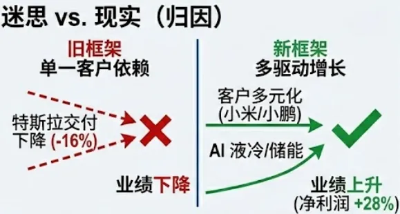 市场习惯用“特斯拉销量”去倒推三花的业绩走向,这种旧框架在当前阶段会产生严重的系统性误判。因为三花的客户结构已经发生了质的蜕变。看一组关键数字把矛盾钉死:特斯拉Q4交付量同比下降16%,但三花同期的净利润中位数却逆势同比大涨28% 。认知更新结论:非特斯拉阵营大涨与AI新场景红利,已完全接棒并超越了单一客户依赖。证据1:国产新势力(小米、小鹏、吉利等)强劲需求爆发(事实)→ 冲抵了单一海外大厂的波动(机制)→ 汽零营收继续保持双位数增长(验证)证据2:数据中心液冷和储能组件放量(事实)→ 提供了脱离传统空调排产周期的高毛利增量(机制)→ 制冷板块逆势维持约10%年增速(验证)证据3:海外建厂(墨西哥、波兰)(事实)→ 规避地缘风险并锁定全球核心供应链席位(机制)→ 核心大厂出海订单份额稳固(验证)本质判断:这件事的本质不是三花还在吃单一大厂红利,而是它已成为全行业技术迭代不可或缺的“卖水人”。操作含义:必须下调单一车企交付数据在跟踪模型中的权重,上调中国新势力排产与数据中心液冷出货量的跟踪权重02 | 利润弹性来自哪里?结构向上+极强定价权