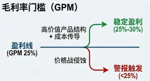 - 定价权生死线|综合毛利率(GPM)|财报季报|每个季度|阈值:严守25%-30%区间 |动作:若跌破25%,立刻终止看多主业盈利弹性的逻辑
