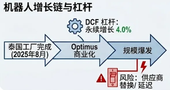 传统误判:市场一看2025年机器人业务预计营收才区区约1个亿,觉得连牙缝都不够塞,直接判定为纯概念炒作,不配给主业估值溢价 。估值里的最强杠杆点:DCF模型中的永续增长率(被小摩从3.5%上调至4.0%)。为什么它是杠杆?因为在折现模型中,微小的永续期增速上调会通过复利极大地放大最终的企业终值(Terminal Value),这意味着外资认为机器人彻底掀开了三花长期的天花板关键验证窗口:2025年8月底及随后的几个季度,必须看到泰国工厂产能如期落地,且核心大客户(特斯拉)的机器人投产进度符合预期 。撤回条件=估值逻辑崩塌:大客户Optimus核心机电执行器突然切换为其他供应商,或泰国工厂建设长期停滞不前。04 | 写在最后:核心假设&关键跟踪指标