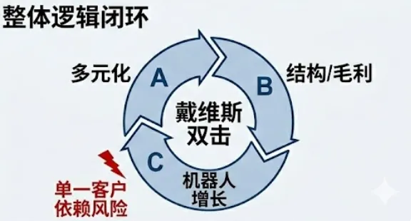 三花的业绩弹性不是单纯靠“量”堆出来的,核心驱动力明确指向“结构(优先级最高)”与“价”。在“量”的层面,有以旧换新政策托底 ;但在“结构”层面,高附加值组件(如电子膨胀阀、热泵技术部件)的占比正在急剧拉升 ;“价”的层面,公司展现出了对上游压价、对下游传导的绝对定价权 。成立阈值:公司整体毛利率(GPM)在单季度财报中持续稳定在 25%-30% 的绝对安全区间内 。若不成立会怎样:如果综合毛利率实质性跌破25%,这就是最危险的反向信号,证明行业价格战的炮火已经烧穿了公司的技术护城河,定价权正式宣告失效。【市场解读】:行业补贴透支严重,价格战惨烈,供应链利润必将被双重挤压。【结构判断】:高附加值产品占比的拉升与硬核的成本转嫁能力,完美对冲了通缩压力。操作含义:盈利结构正在不断强化。交易层面,领先信号应死盯大宗商品(铝/铜)暴涨后,下个季度公司财报毛利率的坚挺程度03 | 机器人业务:如何给遥远的“大饼”估值?
