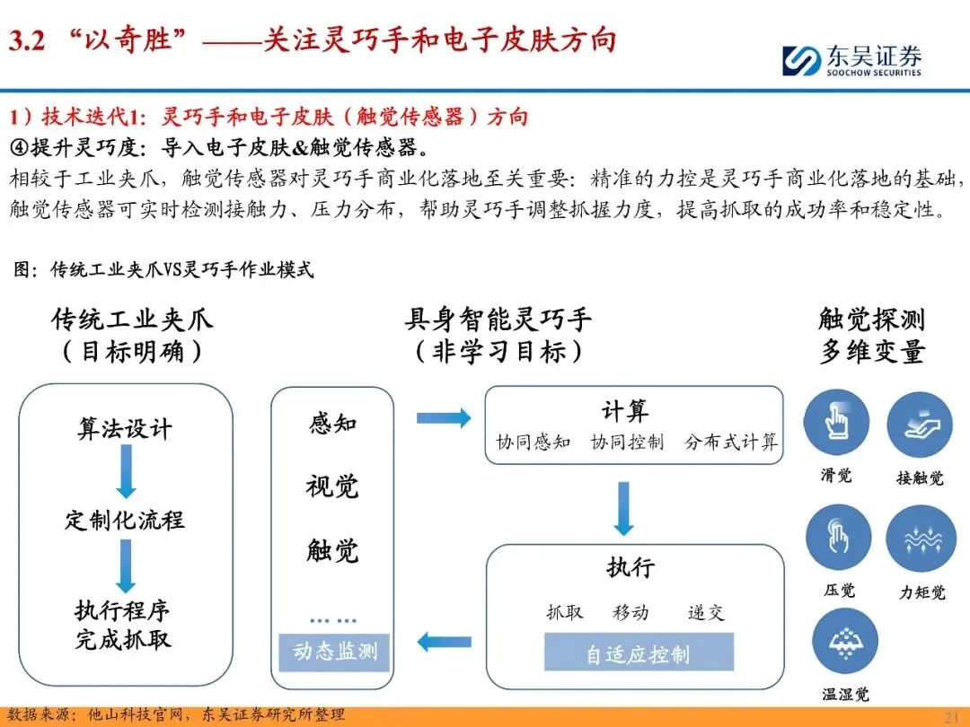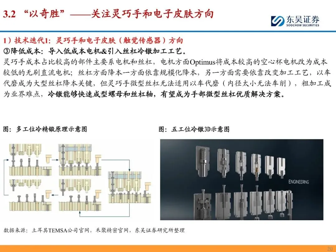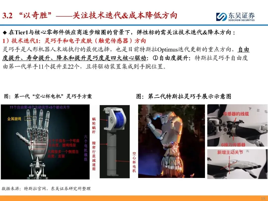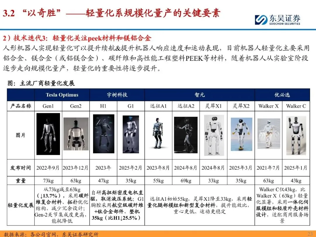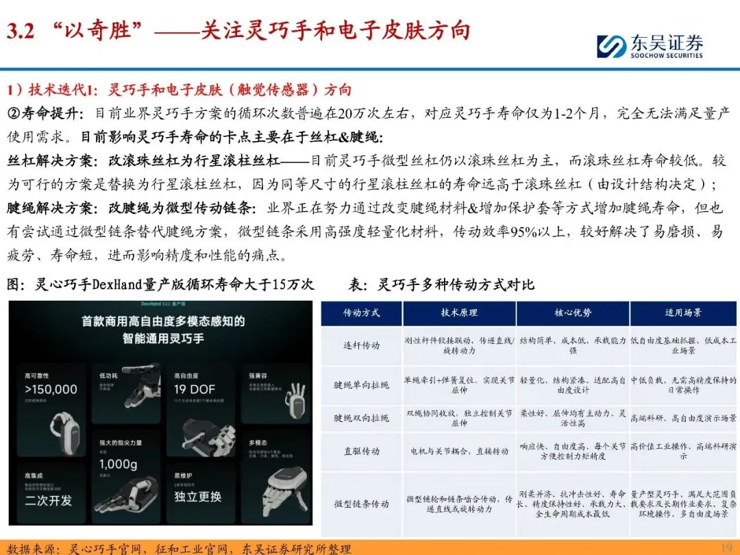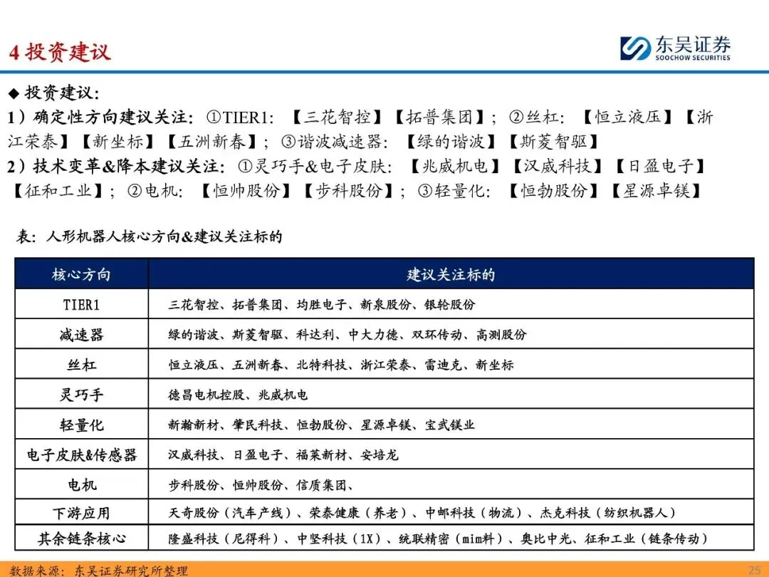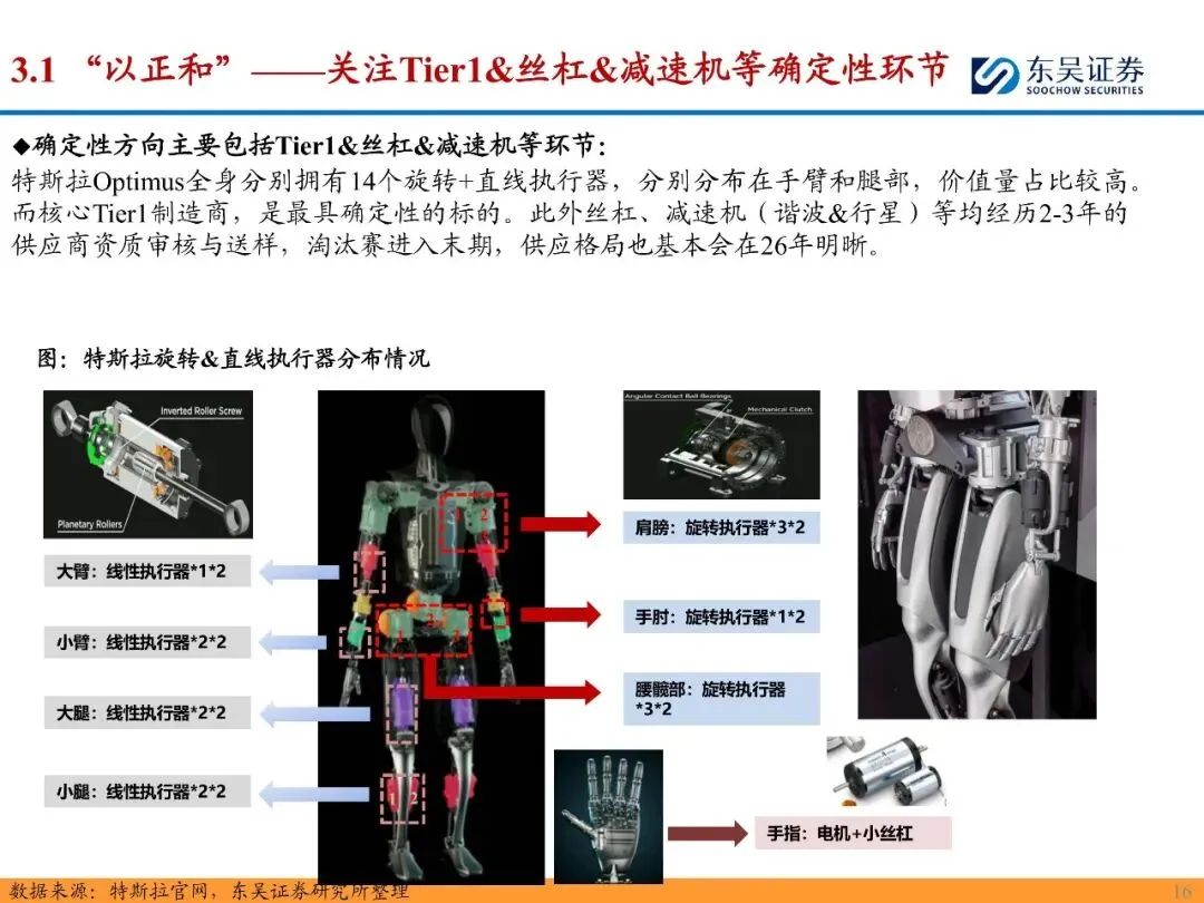 2026年人形机器人策略应“以正和,以奇胜”,重视量产确定性同时关注技术迭代与降本方向。 确定性方向包括特斯拉Optimus等Tier1供应链、丝杠、减速机等核心零部件供应商,这些领域供应格局逐步明晰,具有较高确定性。同时,关注宇树等国内龙头上市机遇,把握国产链崛起红利。在技术迭代与降本方向,灵巧手自由度提升、寿命延长、降本及灵巧度提升是核心驱动力,电机新技术如轴向磁通电机加速渗透,轻量化材料如peek和镁铝合金的应用提升机器人性能。建议投资者关注这些领域的弹性标的,以把握人形机器人规模化量产元年的投资机会。