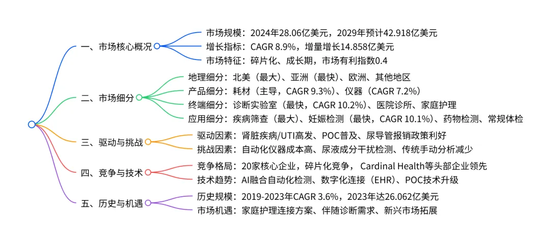 2024-2029 年全球尿液分析市场呈现稳步增长态势,2024 年市场规模达 28.06亿美元,预计 2029 年将增至 42.918 亿美元,年复合增长率(CAGR)为 8.9%,增量增长 14.858 亿美元;市场结构呈碎片化特征,北美为最大市场(2024 年占比 39.5%),亚洲为增长最快区域(CAGR 10.2%);产品端以耗材为主导(2024 年占比 77.9%,CAGR 9.3%),终端端诊断实验室增长最快(CAGR 10.2%),应用端疾病筛查占比最高(2024 年 48%)且妊娠检测增速领先(CAGR 10.1%);市场增长受肾脏疾病和尿路感染患病率上升、即时检验(POC)应用普及等因素驱动,但面临自动化分析仪成本高、尿液成分干扰检测结果等挑战,AI 技术融合与新兴市场拓展为主要机遇。
