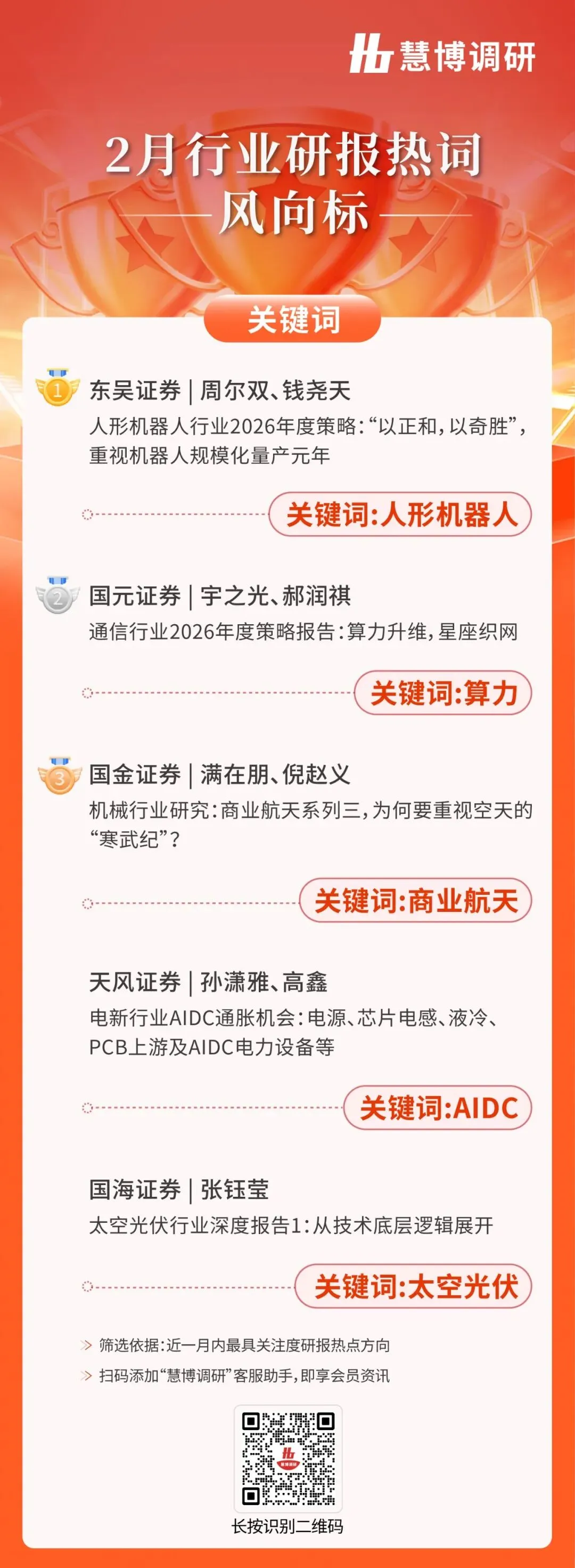 通过慧博投研“600W+注册用户,90%机构用户”的庞大客户群体,本月我们揭晓2026年2月行业研报两大榜单——“行业研报热词风向标”、“重获券商青睐公司研报TOP榜”。本次榜单的评选基于深入的数据分析和严谨的评选指标,全方位展现市场热点与企业潜力,旨在为读者提供精准、前瞻的市场洞察,助力把握投资先机。
