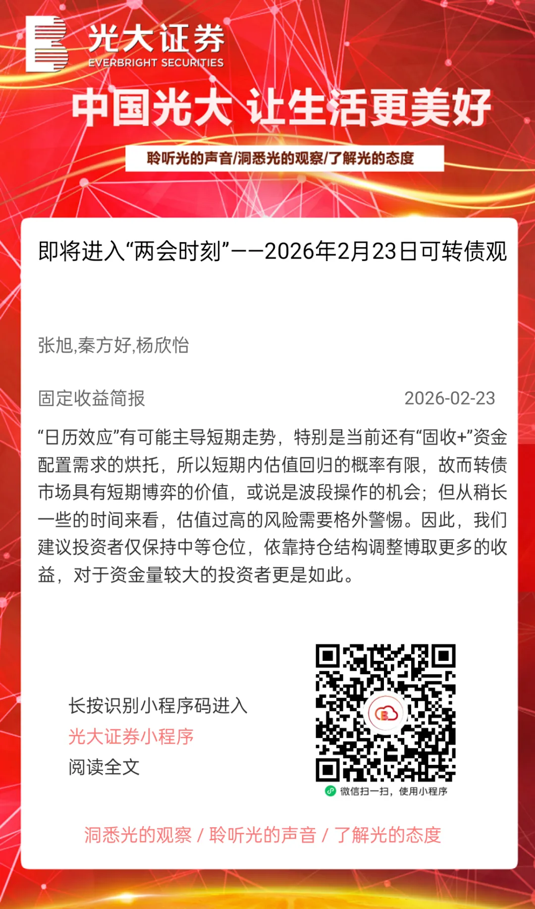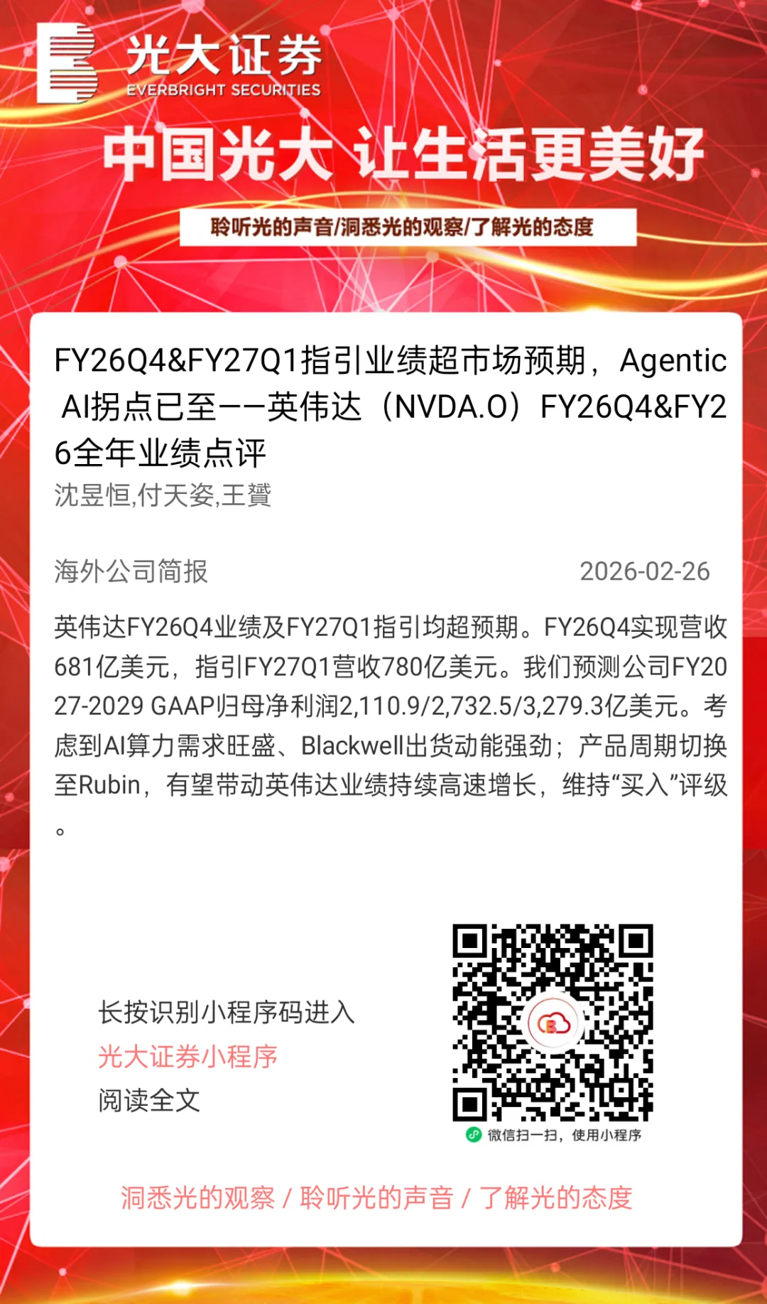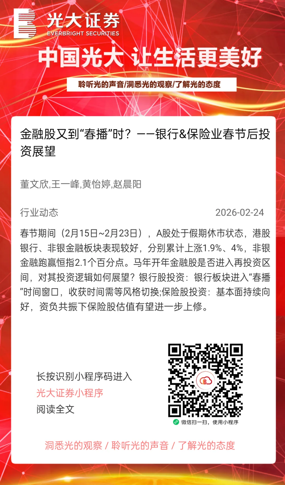 本订阅号中所涉及的证券研究信息由光大证券研究所编写,仅面向光大证券专业投资者客户,用作新媒体形势下研究信息和研究观点的沟通交流。非光大证券专业投资者客户,请勿订阅、接收或使用本订阅号中的任何信息。本订阅号难以设置访问权限,若给您造成不便,敬请谅解。光大证券研究所不会因关注、收到或阅读本订阅号推送内容而视相关人员为光大证券的客户。