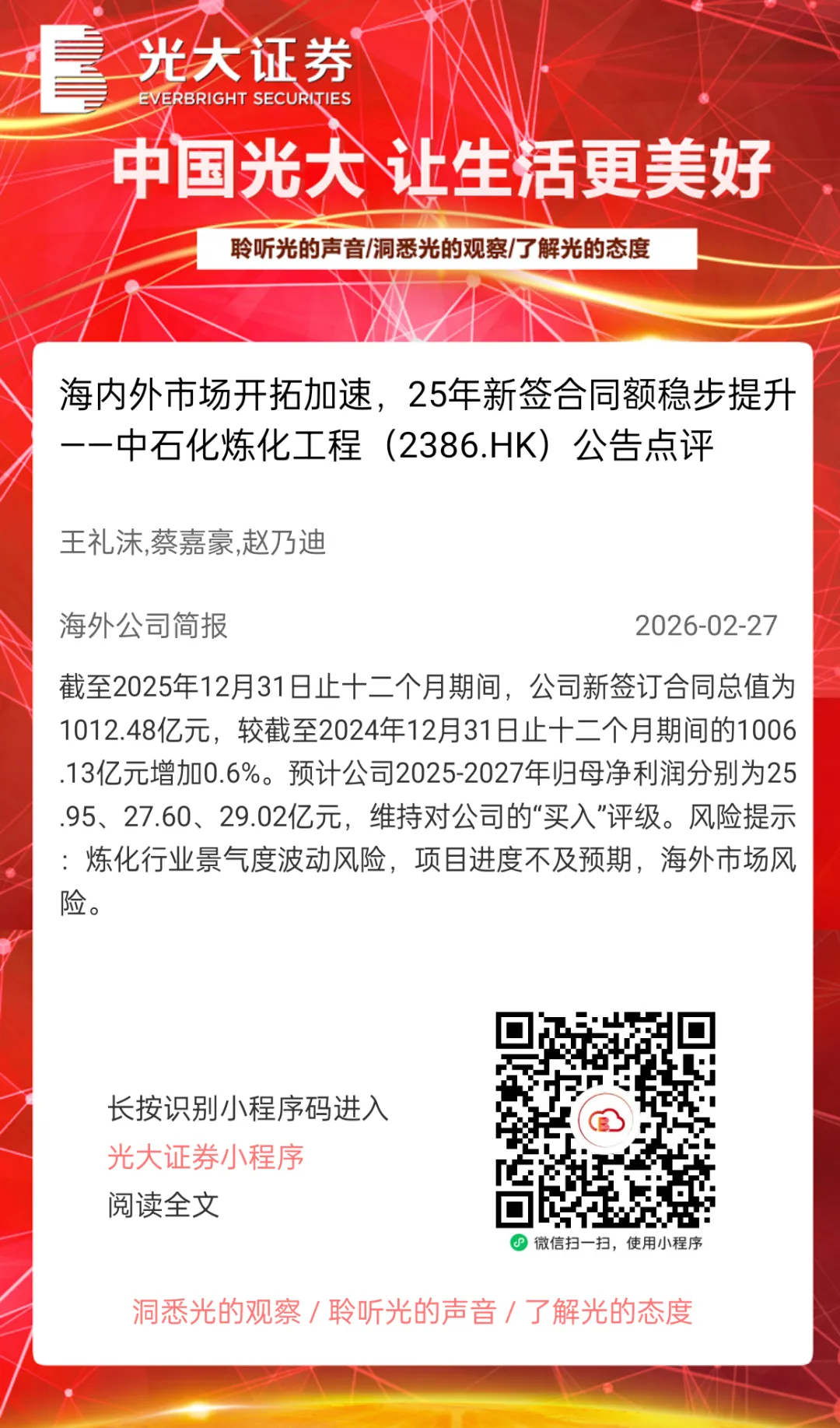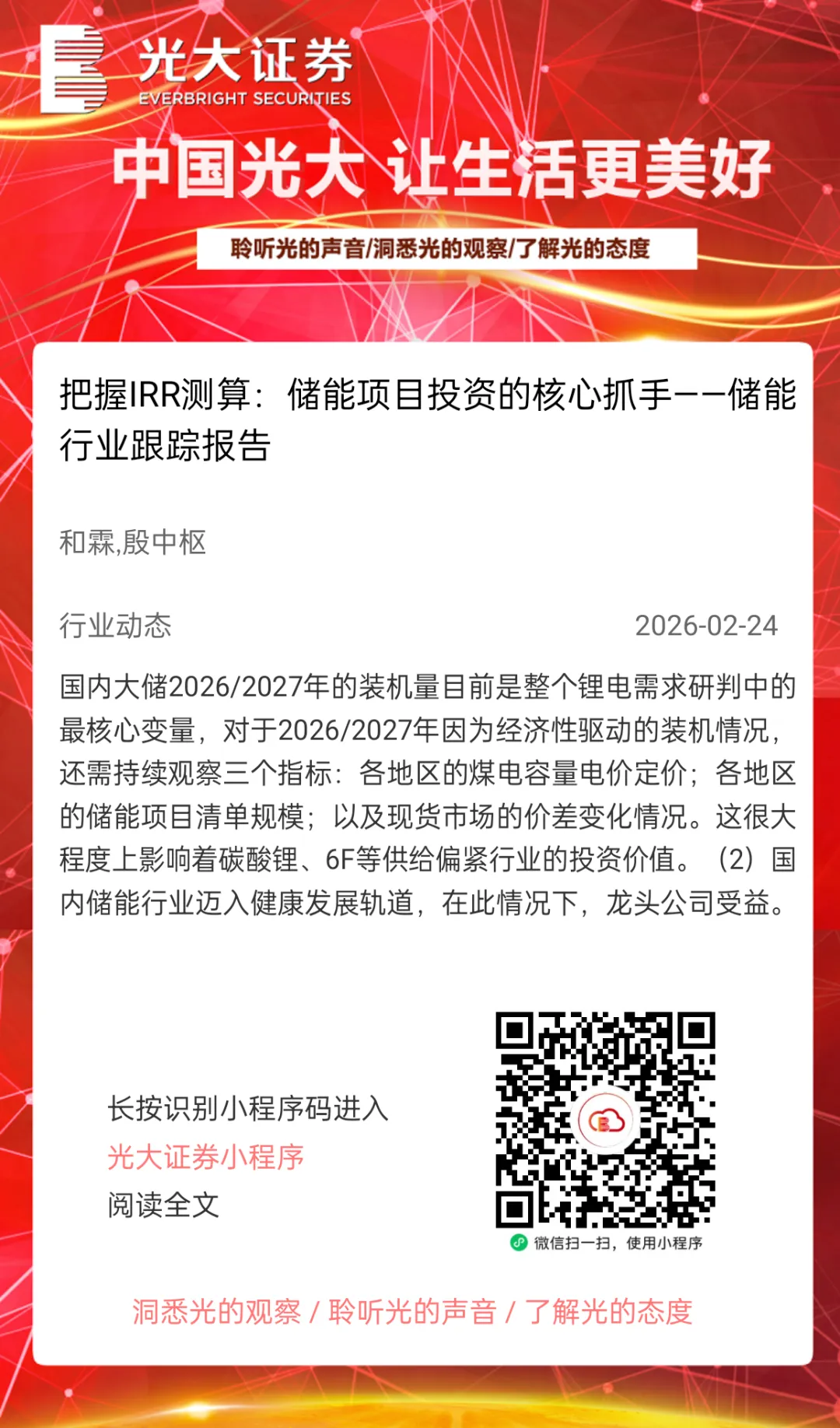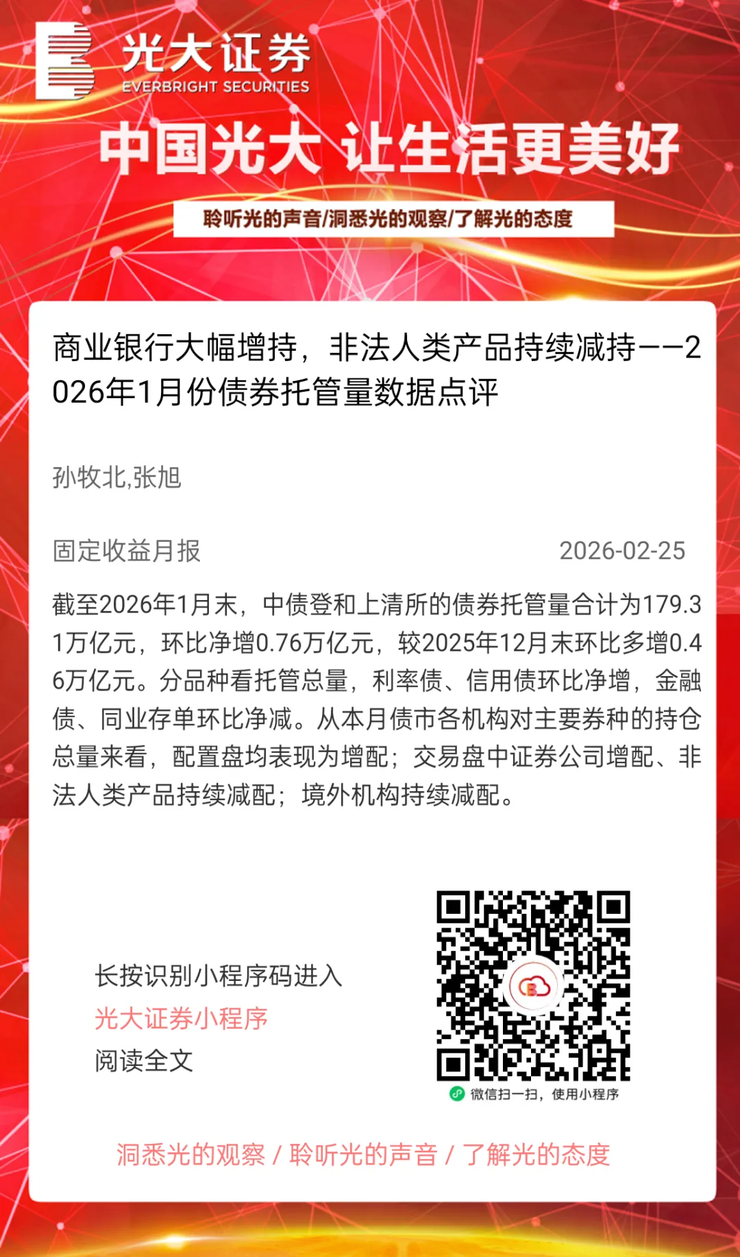 本订阅号中所涉及的证券研究信息由光大证券研究所编写,仅面向光大证券专业投资者客户,用作新媒体形势下研究信息和研究观点的沟通交流。非光大证券专业投资者客户,请勿订阅、接收或使用本订阅号中的任何信息。本订阅号难以设置访问权限,若给您造成不便,敬请谅解。光大证券研究所不会因关注、收到或阅读本订阅号推送内容而视相关人员为光大证券的客户。