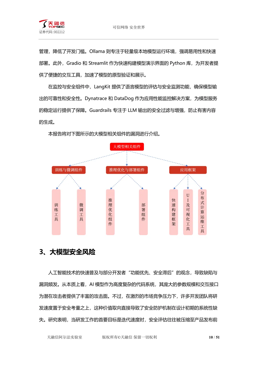 但报告提醒的重点是:大模型生态是一个“组件拼装机”——推理引擎、部署框架、UI 面板、运维平台、工作流工具……哪一个默认配置不安全、哪一个版本没打补丁,都会让你在生产环境里“开天窗”。