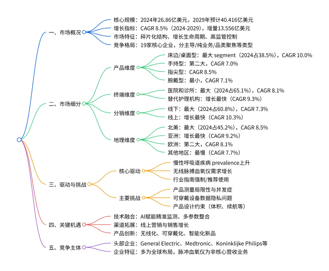 全球脉搏血氧仪市场在2024年规模达26.86亿美元,预计2024-2029年以8.5%的 CAGR增长至40.416亿美元,增量增长13.556亿美元;市场呈碎片化竞争格局,北美为最大市场(2024年占比45.2%),亚洲是增长最快区域(CAGR 9.2%);产品端以床边/桌面型为主(2024年占比 38.5%,CAGR 10.0%),终端以医院和诊所为核心(2024年占比 65.1%),分销渠道中线上渠道增长最快(CAGR 10.3%);驱动因素包括慢性呼吸道疾病 prevalence 上升、无线产品需求增长及行业指南推荐,挑战主要为产品局限性、数据隐私问题和设计约束,AI 技术融合与新产品推出为主要机遇。