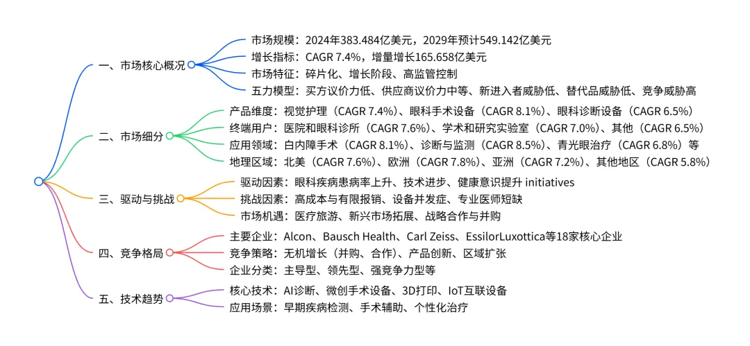 2024-2029年全球眼科设备市场呈现稳健增长态势,2024年市场规模达383.484亿美元,预计2029年将增至549.142亿美元,期间复合年增长率(CAGR)为7.4%,增量增长达165.658亿美元;市场结构呈碎片化特征,视觉护理是最大产品细分市场(2024年占比 81.8%),医院和眼科诊所为主要终端用户(2024年占比79%),白内障手术是核心应用领域(2024年占比 35.2%),北美为最大区域市场(2024 年占比 39.4%)且欧洲为增长最快区域(CAGR 7.8%);驱动因素包括眼科疾病患病率上升、技术进步及健康意识提升,同时面临高成本、设备并发症及专业医师短缺等挑战,市场竞争激烈且新进入者威胁低,AI技术的融入正重塑诊断与治疗模式。
