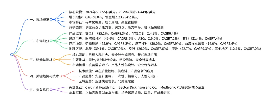 全球皮下注射针市场在2024年规模达50.655亿美元,预计2029年将增长至74.449亿美元,CAGR 为8.0%,增量增长23.794亿美元;市场呈碎片化竞争格局,安全针(占 2024 年市场份额 85.1%)是最大且增长最快的产品segment,医院和诊所是核心终端用户(占2024年市场份额 49.6%),药物输送为主要应用场景(占2024 年市场份额55.9%),北美是最大区域市场(占2024年市场份额 39.1%),而亚洲是增长最快区域(CAGR 9.3%);驱动因素包括目标人群扩大、安全针合规要求提升及新兴市场扩张,主要挑战为无针替代技术、感染风险和安全针高成本,AI 技术正从质量控制、供应链等维度赋能行业发展。