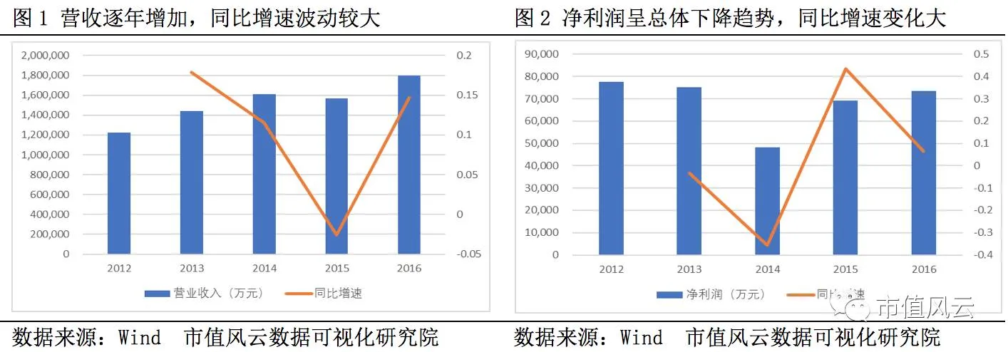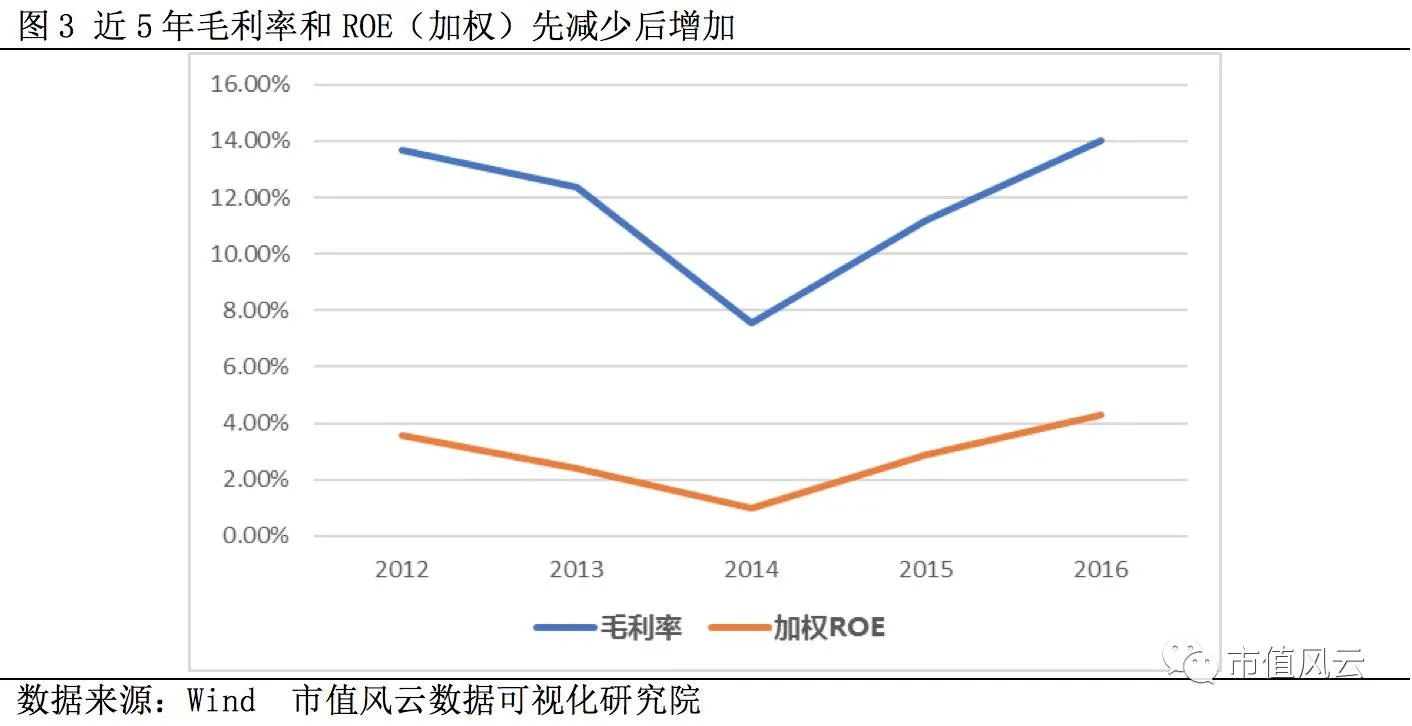 近5年毛利率先降后升,呈现明显“V”型特征,但整体毛利率水平仍然较低,2016年为14%,加权ROE随毛利率水平波动,但,维持较低水平,2016年仅仅是4%。