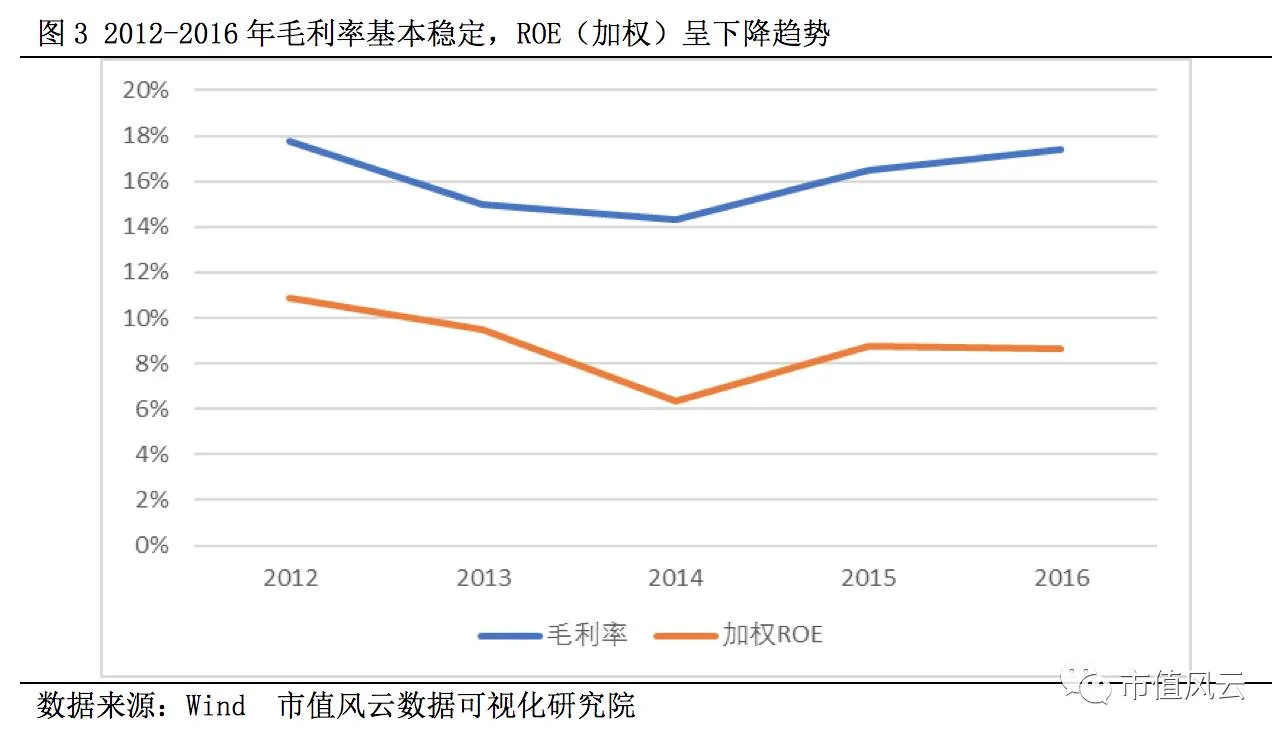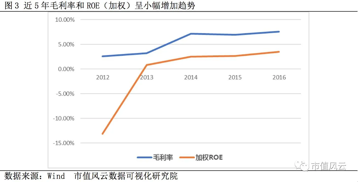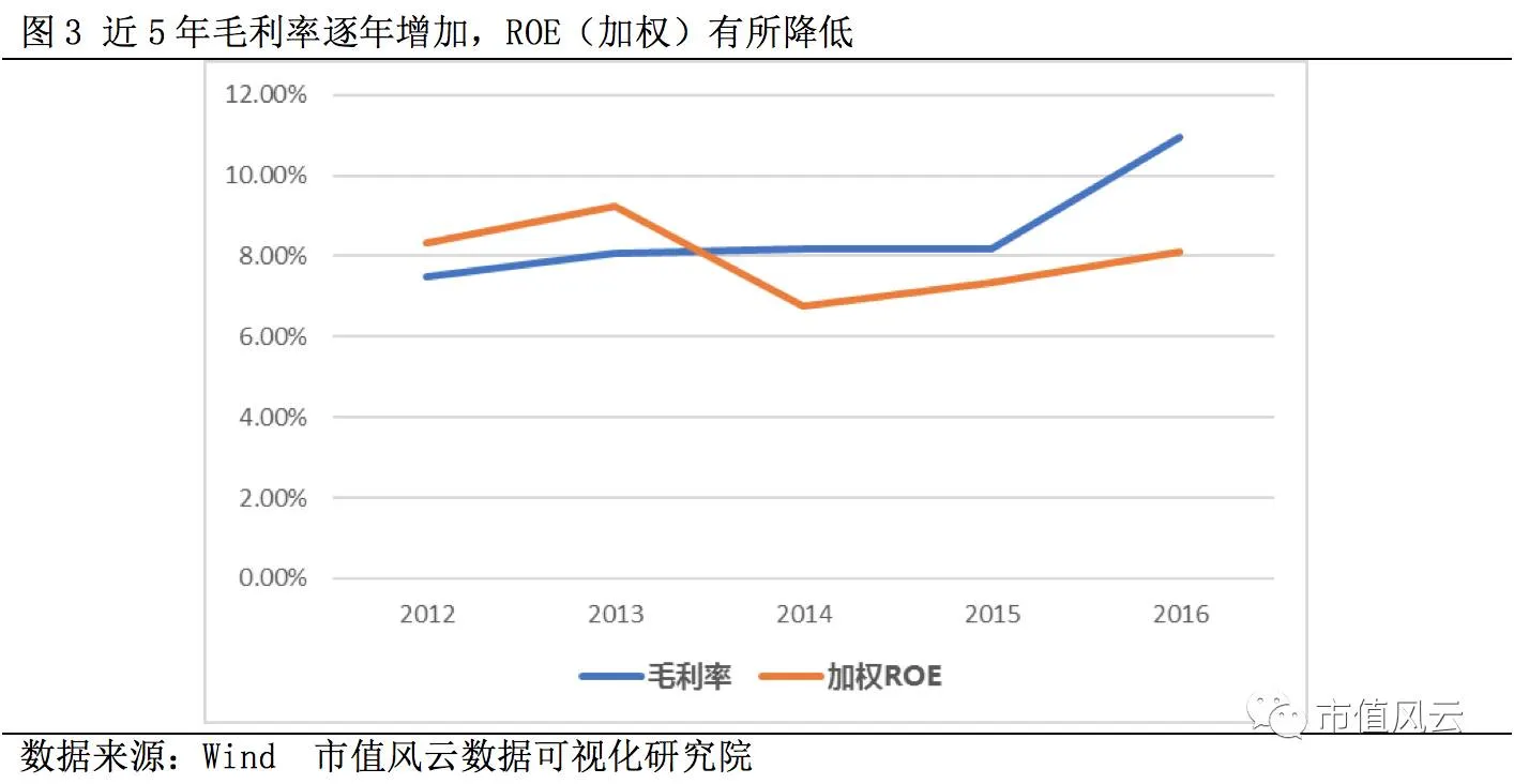 2012-2016年公司毛利率和加权ROE同步增加,但是毛利率不超过10%,处于较低水平,ROE同样如此。