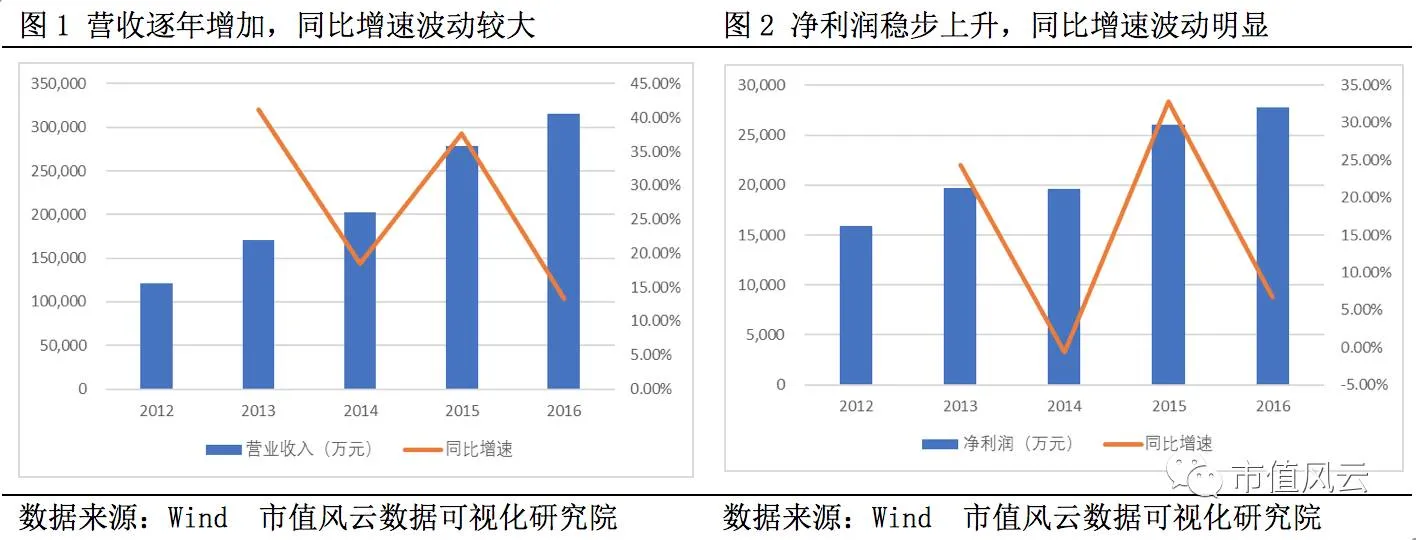 公司主要聚焦于汽车材料领域,业务为高分子材料和高性能纤维及其复合材料的研发、生产、销售和服务,主要产品用途作为原材料,用以加工生产汽车用复合材料部件,最终安装应用于汽车内外部各相关系统。公司营业收入逐年增加,由2012年的12.12亿元增加至2016年的31.58亿元,年均复合增长率为21.12%,净利润同样呈逐年增加趋势,但增速波动较大。