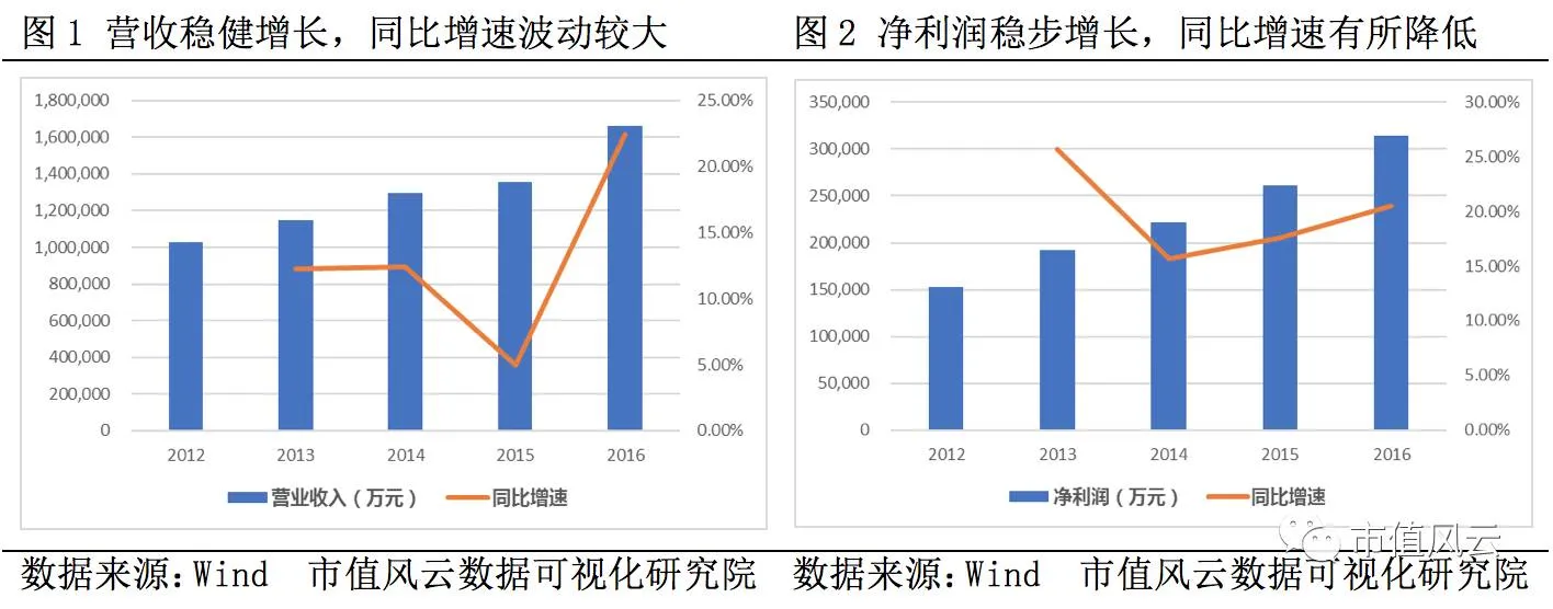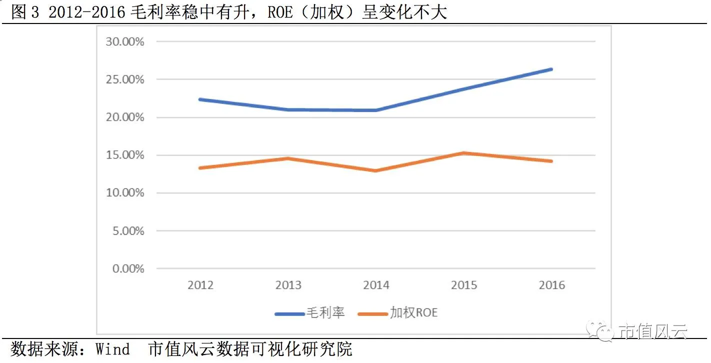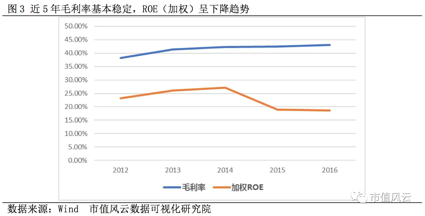 2012年至2016年公司毛利率逐年增加,2016年达到46.75%,加权ROE相对稳定,基本高于17%,2016年达到22.33%。