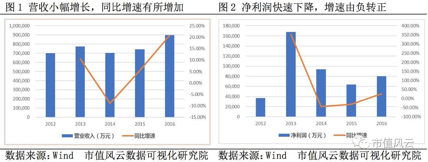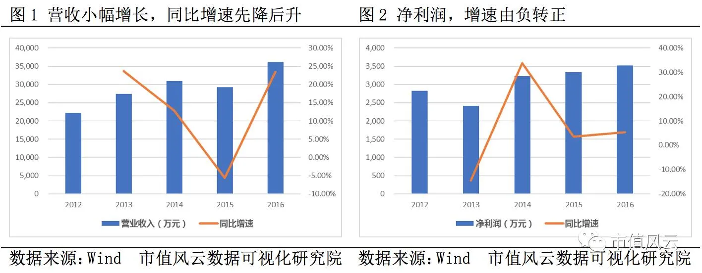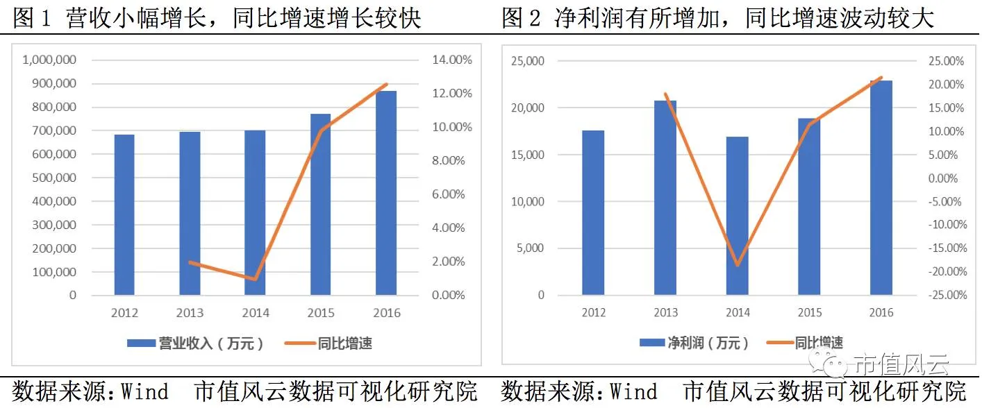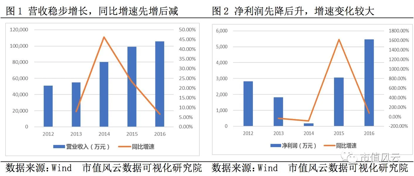 公司主要业务包括以纺织品为主的外贸进出口和国内贸易业务、以汽车内饰和纺织新材料业务为主的产业用纺织品业务。2012年至2016年,公司营收和净利润呈小幅增长态势,同比增速也有所增加,2016年全年实现营收和净利润为86.75亿元和2.29亿元,同比增速为12.57%和21.45%。