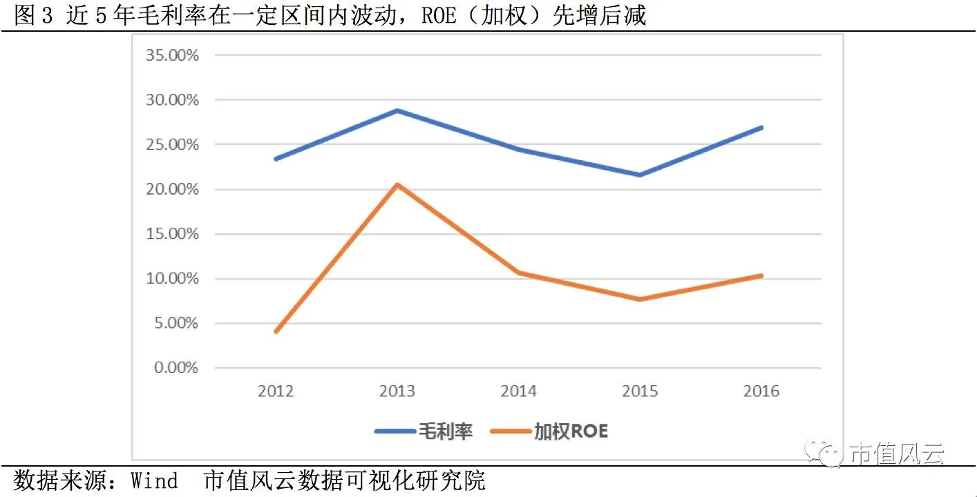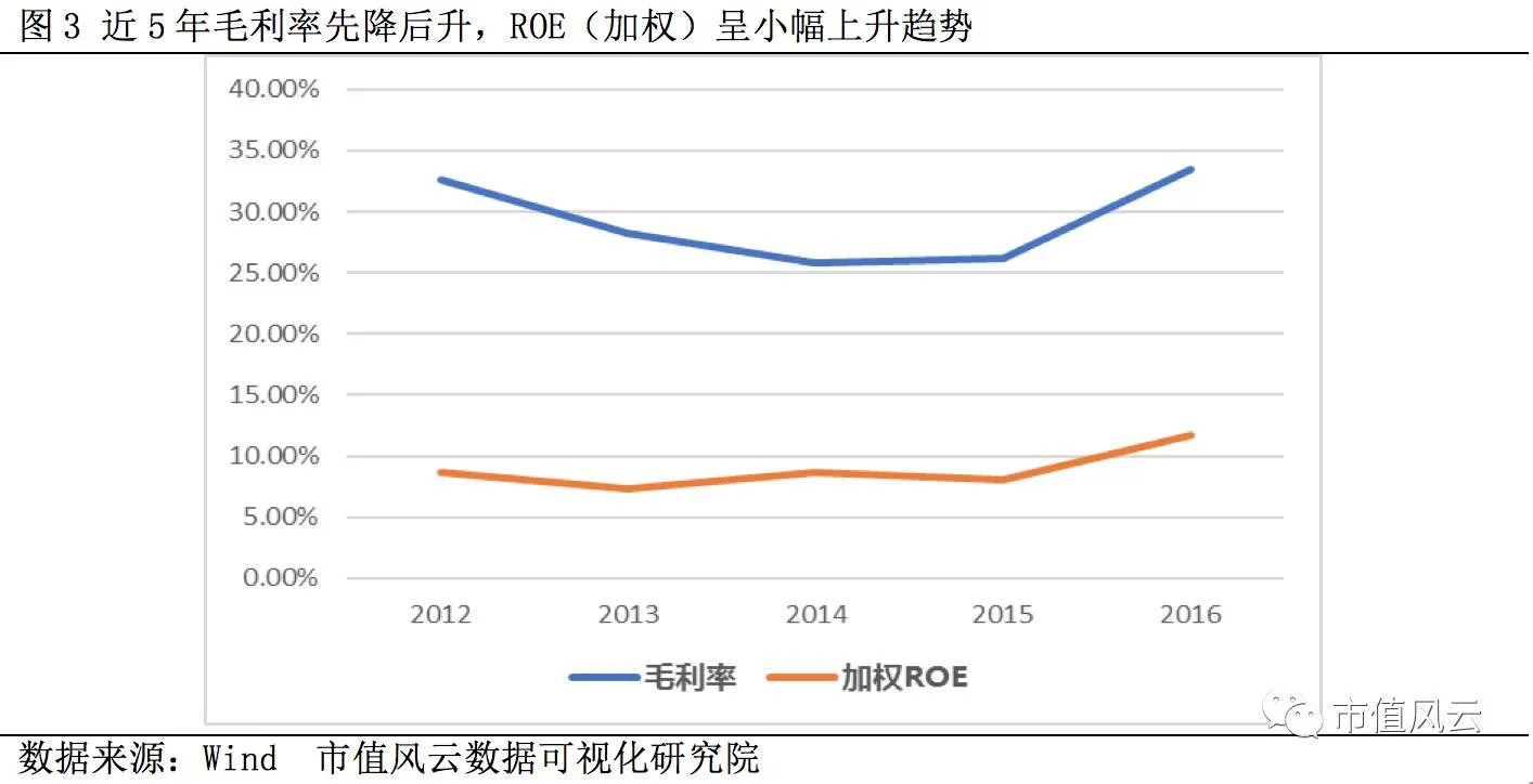 近5年毛利率先降后升,2016年毛利率达到33.41%,加权ROE呈小幅增加趋势,数值上和毛利率差距较大,2016年达到11.69%。