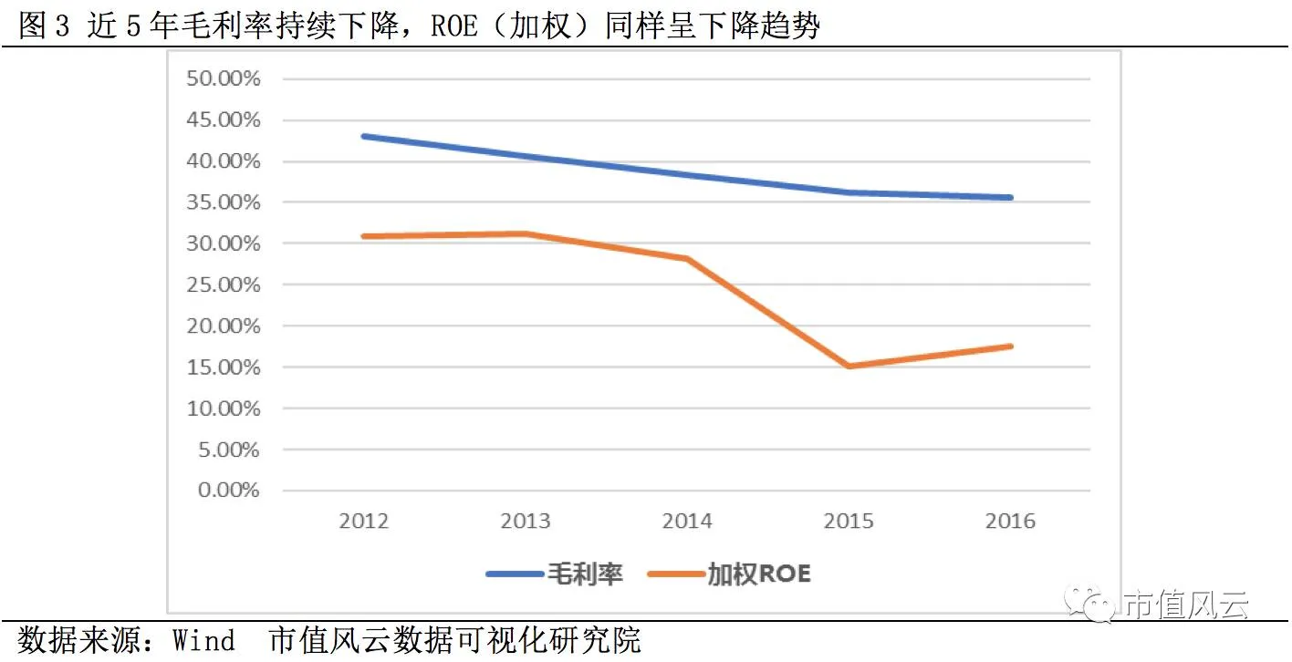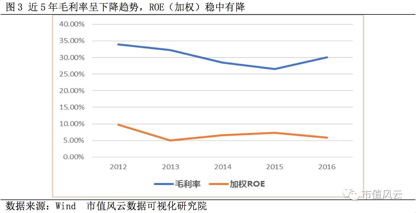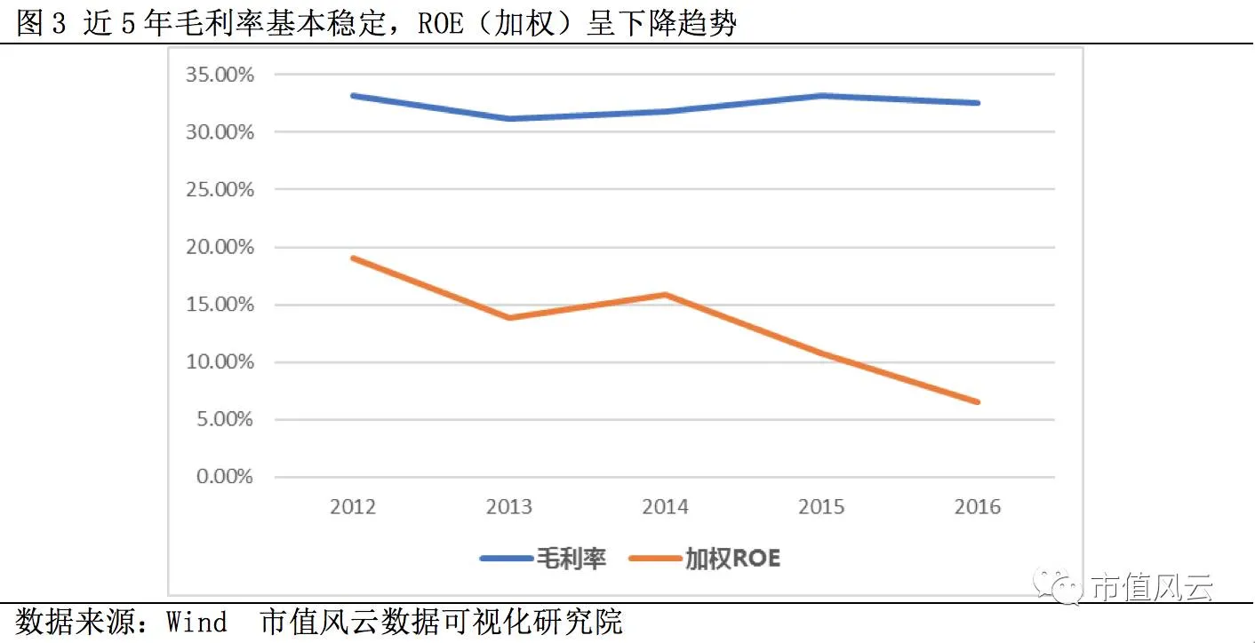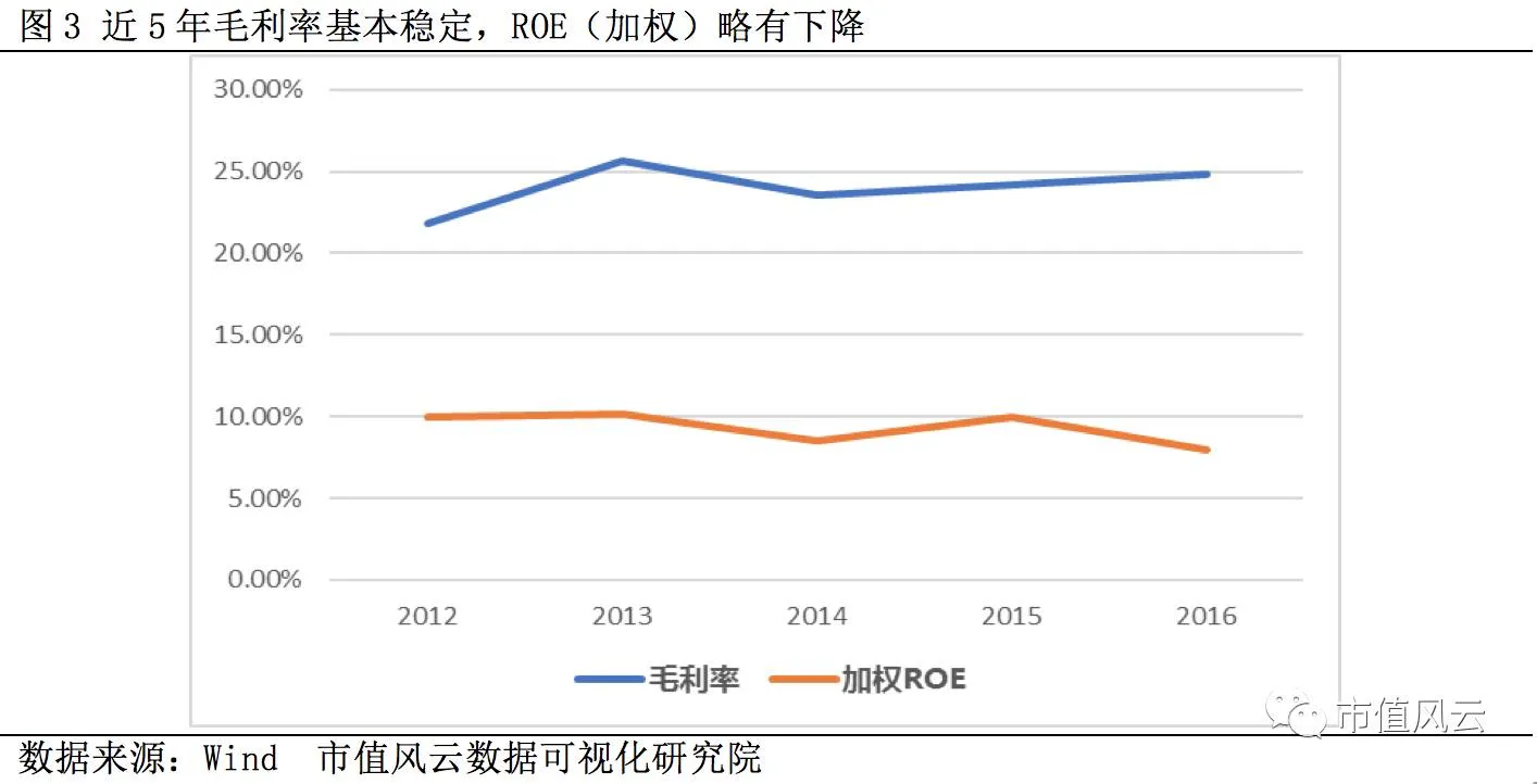近5年毛利率下降趋势,2016年毛利率左右35%,与行业毛利率水平基本持平,加权ROE下降趋势明显,2016年仍有18%左右。