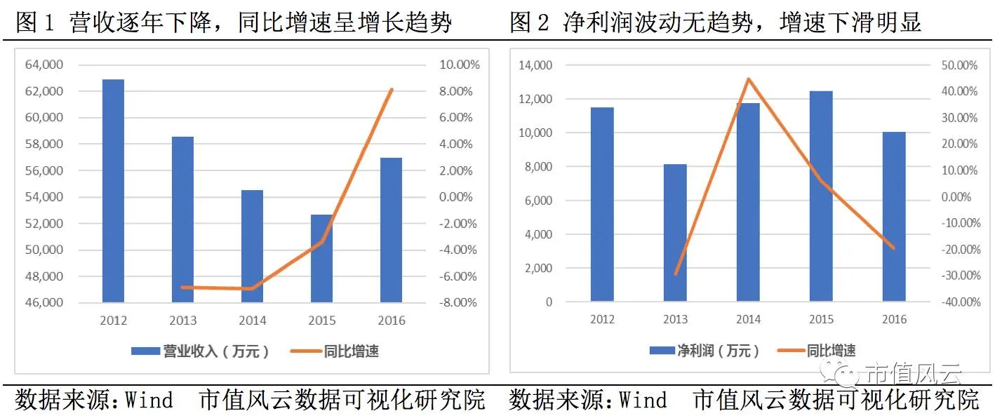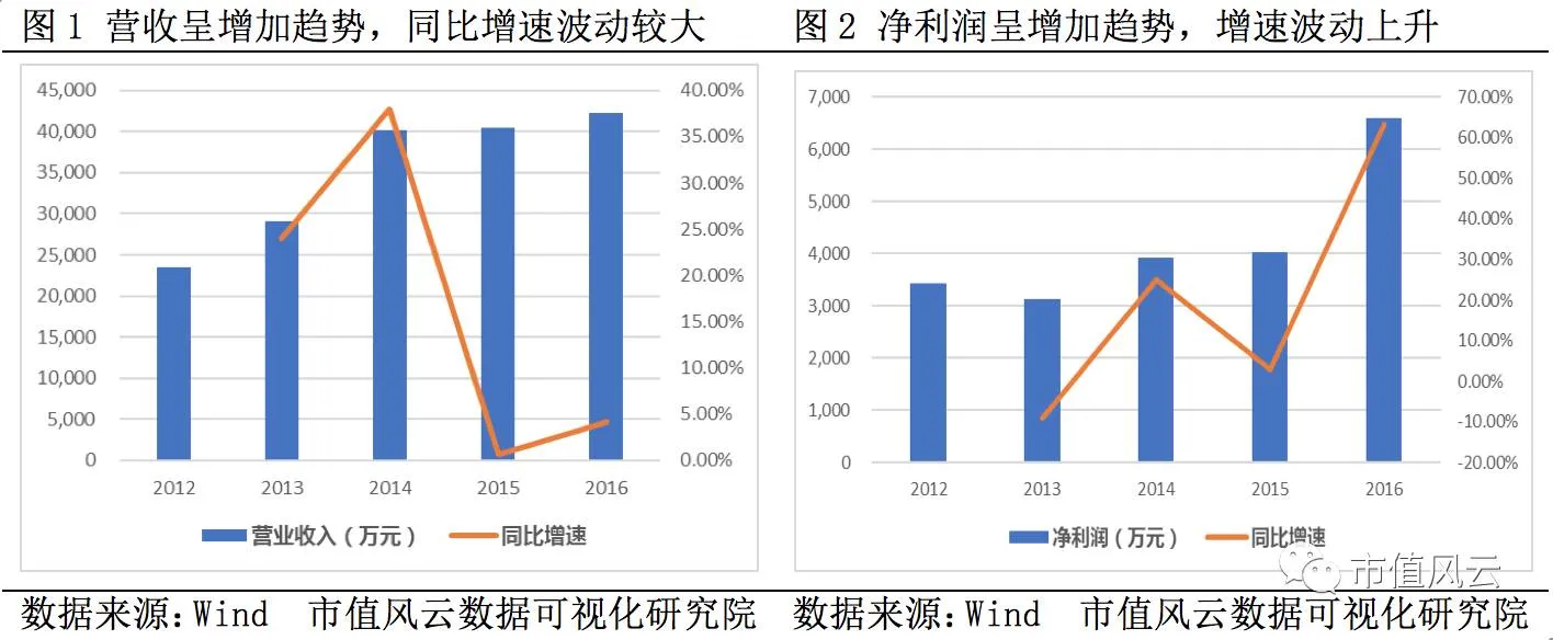 公司是一家集经编织物织造和染色后整理于一体的大型企业。目前已成为全国最大的汽车内饰面料生产厂家之一,拥有从德国等国家引进的具有世界先进水平整经机等先进设备,已形成织造、染色、起绒、定型一条龙生产线。2012-2015年公司营收逐年下降,直至2016年有所回升,全年实现营收5.7亿元;净利润呈波动趋势,2016年实现净利1亿元,同比增长率为-19.49%。
