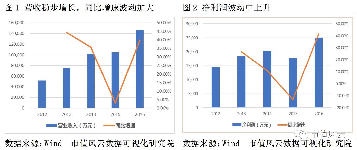 公司以汽车零部件研制、生产和销售为主营业务,涵盖智能汽车电子、新能源汽车电子、智能制造等领域。2012-2016年公司营收和净利润保持较快增长,年均复合增长率分别为36%、21%,其中,2016年营收、净利润增速分别为130%和61%,相比以前年度的增速大幅增加,主要是KSS、PCC业务并表,带来业绩显著提升。