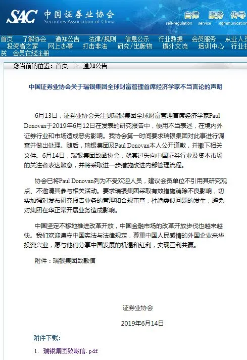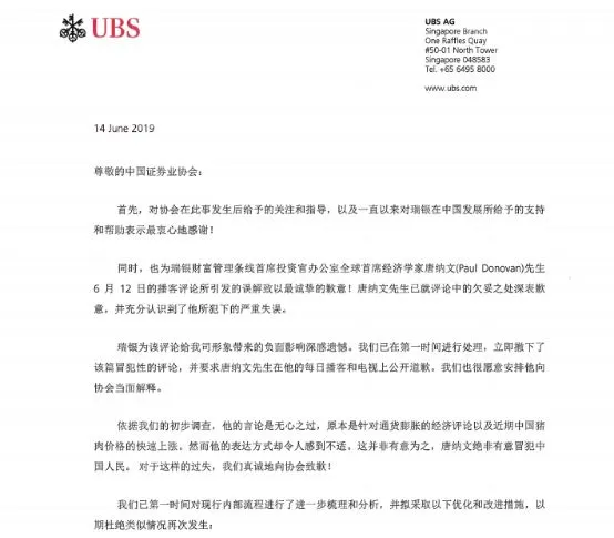 协会表示,关注到瑞银集团全球财富管理首席经济学家Paul Donovan于2019年6月12日在发表的研究报告中,使用不当表述,在境内外证券行业和市场造成恶劣影响。协会第一时间要求瑞银集团对此事进行调查并做出处理。6月14日,瑞银集团致函协会,就其过失向中国证券行业及资本市场的关注者表达歉意,并将采取进一步措施改进内部管理流程。