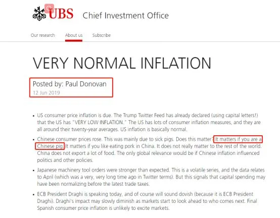 这一严肃事件最早发生在6月12日,在瑞银财富管理全球首席经济学家唐纳文(Paul Donovan)发布的最新研报里,竟然出现了“If you are a Chinese pig”这样涉嫌种族歧视的辱华言论。