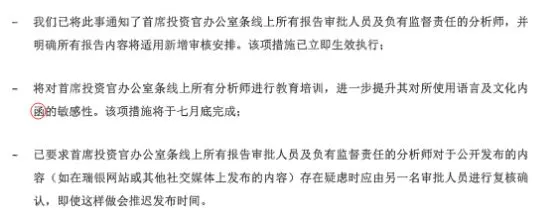 这份声明同时还介绍了事件处理的最新进展。瑞银表示,公司已第一时间对现行内部流程进行了进一步梳理和分析,并将采取优化和改进措施,以期杜绝类似情况再次发生。具体措施包括新增报告内容审核安排,对分析师进行教育培训等。