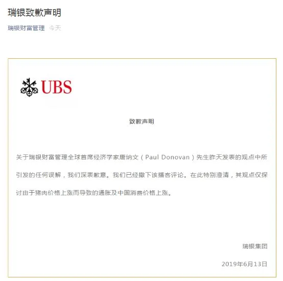 实际上,早在6月13日傍晚,瑞银就在官网和官微分别发布致歉声明,称“关于瑞银财富管理全球首席经济学家唐纳文(Paul Donovan)先生12日发表的观点中所引发的任何误解,我们深表歉意,我们已经撤下该播客评论。在此特别澄清,其观点仅探讨由于猪肉价格上涨而导致的通胀及中国消费价格上涨”。