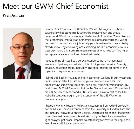 唐纳文(Paul Donovan)在瑞银身居要职,现任职务是瑞银财富管理全球首席经济学家。