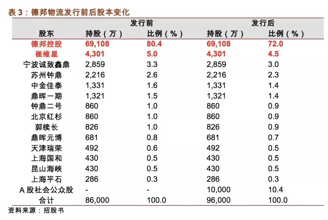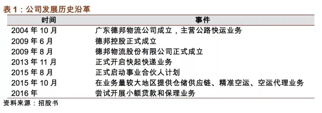 ◯起于华南,从公路快运到综合物流服务。公司前身广东德邦物流成立于2004年,主营公路快运业务;经过13年的发展,公司业务拓展至全国,逐步成为涵盖公路快运、快递、航空货代、供应链金融的综合物流企业。本次发行前,控股股东德邦控股持股80.36%,实际控制人为崔维星。