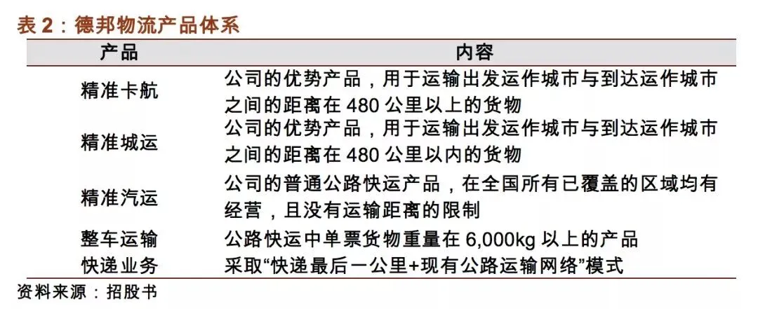 德邦物流一直致力于为我国中小企业提供高品质的公路快运与快递服务,主要产品线包括公路快运业务、快递业务和其他业务(航空货代等)。公路快运业务方面的产品包括:精准卡航(高时效长距离)、精准城运(高时效短距离)、精准汽运(普通时效),以满足客户对货物运输时效的不同需求;公司还针对单票重量较大的快运货物提供整车服务。