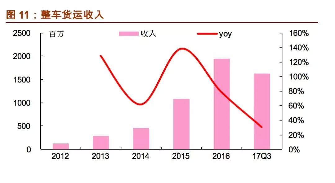 2015年及2016年,公司精准卡航/城运业务的平均单价分别为1.29元/吨公里和1.24元/吨公里,同比变化分别为-5.93%和-3.66%。导致公司调低高时效产品平均单价的原因有:开展“大票产品”细分业务,推广期定价较低;零担市场竞争加剧,推出优惠活动;产品结构调整,开展快递业务;合伙人承揽量提升。