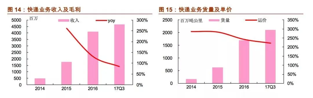 公司14/15/16年度主营业务毛利率分别为17.77%/14.53%/13.41%,综合毛利率下降主要因为毛利率较高的精准卡航/城运业务占比下降。快递业务经过两年多的发展,基本网络布局成型,前期投入在2016年体现规模效应,毛利率由2015年的-12.65%增长至2016年的5.03%。