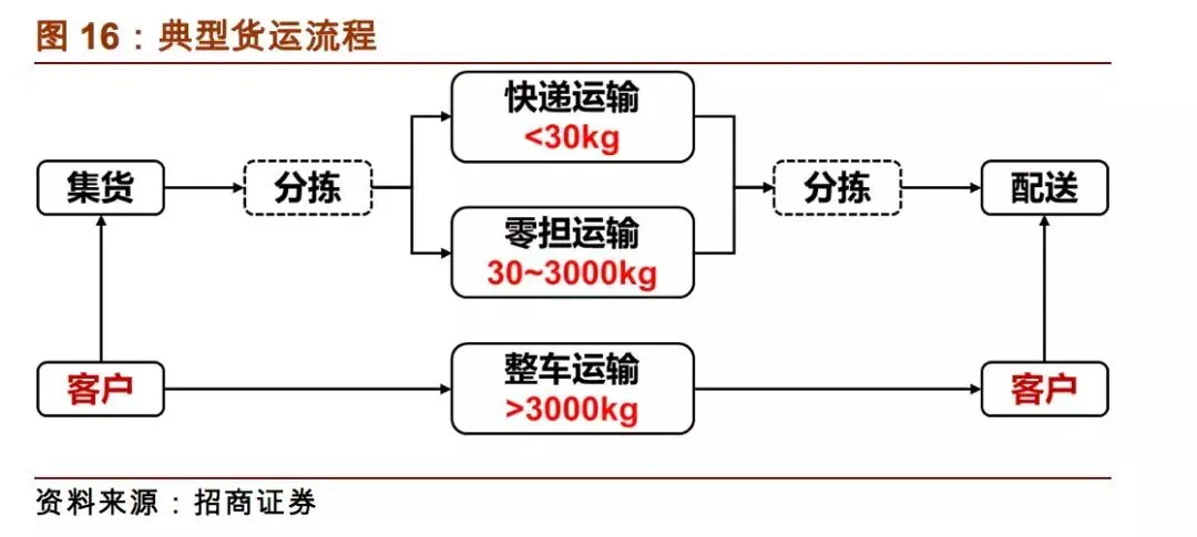 按照货运重量,公路运输从轻到重分为快递(<30kg)、零担(30~3000kg)和整车(>3000kg),主要特征如下: