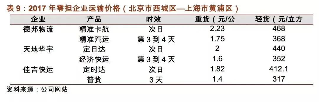 ◯直营模式+事业合伙人,高端产品享受溢价。公司坚持直营模式,并通过事业合伙人扩张业务,保持较高的服务质量,因此维持了高定价。德邦物流精准卡航业务重货单价为2.23元/公斤,高于竞争对手天地华宇、佳吉快运同类型产品10%-20%,议价能力明显占优。