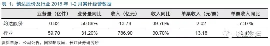 韵达股份公布2018年2月经营指标:2018年2月,公司快递业务量实现1.96亿票,同比下降20.65%;快递收入实现4.03亿元,同比下降25.23%;单票收入为2.06元,同比减少5.78%。