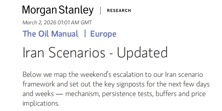 摩根士丹利在2月23日做过一个“伊朗情景分析”框架。这次周末局势升级之后,他们把当前情况对照回原有模型,认为最接近的是 Scenario 4——“船队效率冲击”。
