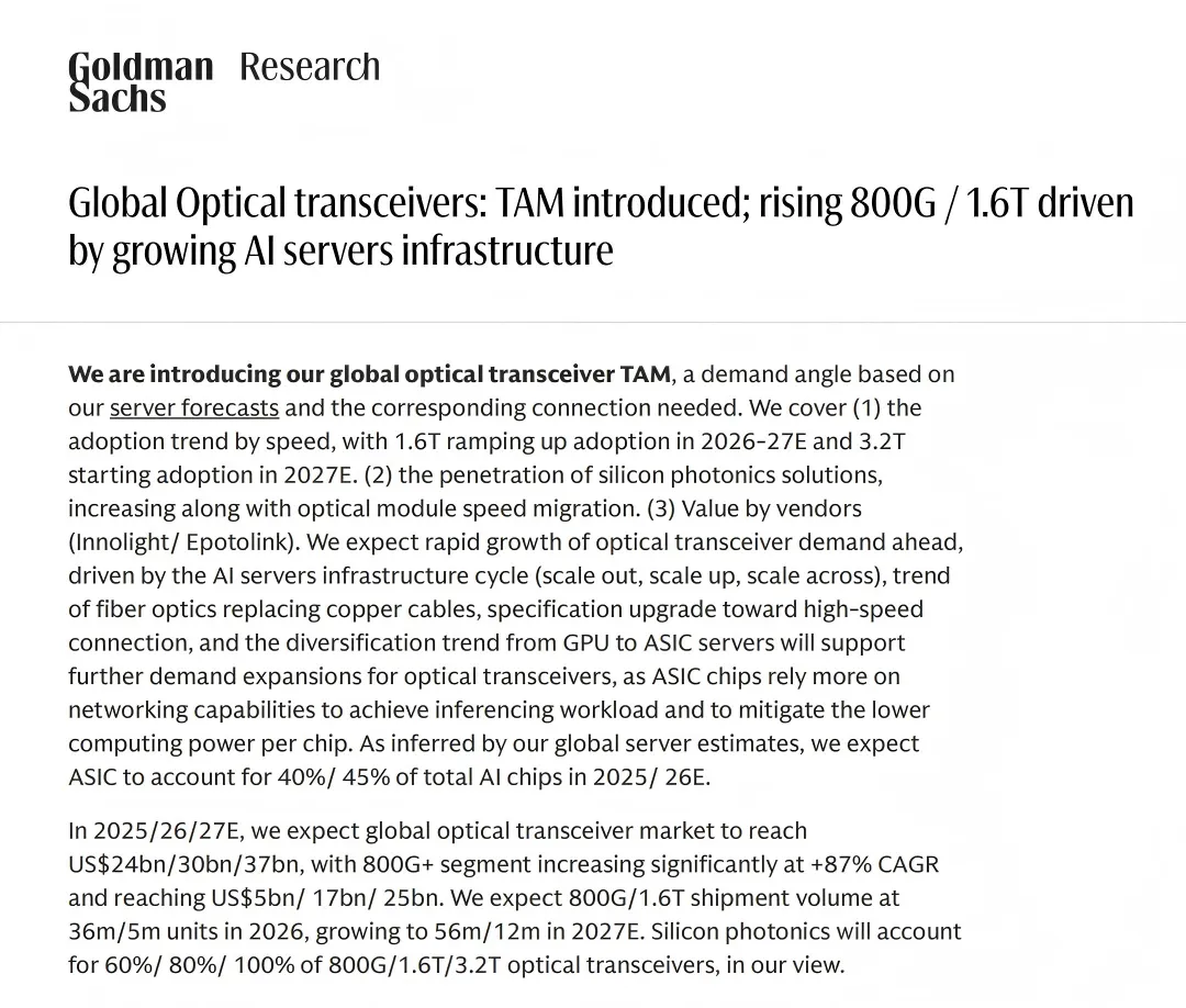 800G 出货量:2027 年将达 5600 万只,较 2025 年的 1000 万只激增 460%,仍是超大规模数据中心的主流配置,适配亚马逊、微软等云厂商的 51.2T 交换机需求。1.6T 出货量:堪称 “增长王炸”,2027 年将飙升至 4200 万只(高盛部分研报预测 1200 万只,取最高增长预期),较 2025 年的 200 万只暴涨 20 倍,成为超大规模 AI 训练的刚需配置。技术渗透率:硅光技术统治高端市场,800G 渗透率达 60%,1.6T 达 80%,2027 年量产的 3.2T 产品将 100% 采用硅光方案。AI 算力需求指数级增长:GPT-6 等大模型训练需要万卡级 GPU 集群互联,800G 已逼近带宽瓶颈,1.6T 成为英伟达 GB300 服务器标配,单 GPU 光模块搭载量从 1.6 升至 5 单元,直接拉动需求翻倍。ASIC 架构崛起放大需求:2026 年 ASIC 芯片占 AI 芯片总量将达 45%,这类芯片更依赖网络性能弥补算力短板,单芯片需搭配 2-3 个光模块,推动配比率持续提升。“光进铜退” 不可逆:高密度 AI 集群对传输距离和抗干扰性要求极高,传统铜缆难以满足,光纤替代趋势加速,进一步打开光模块市场空间。随着 1.6T 在 2026 年全面放量,3.2T 光模块已进入技术储备关键阶段,预计 2027 年正式导入市场,3.2T 将成为硅光技术的 “终极试炼场”,100% 采用硅光方案,而 CPO/LPO 等先进封装技术将进一步降低功耗 30%,推动光模块向更高速率、更低成本、更低功耗演进。从 2025 年 240 亿美元到 2027 年 370 亿美元,光模块行业的爆发式增长,本质上是 AI 算力革命对底层基础设施的必然要求。在 800G 稳守江山、1.6T 全面突围、3.2T 蓄势待发的三重浪潮下,这场关乎全球数字基础设施的 “速率革命”,正为投资者带来历史性的布局机遇。光模块作为数据通信网络中的关键部件,其性能直接决定了整个网络的传输效率和容量。370亿美元的市场规模,不仅是数字,更是对未来科技发展趋势的肯定,再次印证了高速光通信在数字经济发展中的基石作用。随着技术的不断进步和应用场景的持续拓展,光模块行业将迎来一个黄金发展期。让我们共同期待,在800G、1.6T乃至更高速率的光模块驱动下,人工智能与数字世界将更加高效、智能地运转!