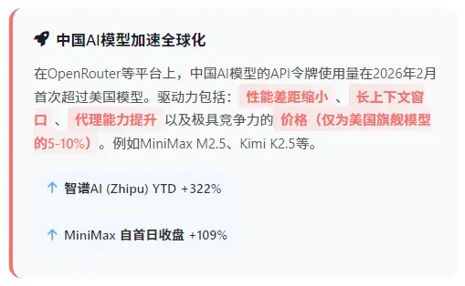 高盛研报-深度解析:中国AI模型上演逆袭,全球算力“定价权”悄然生变高盛在报告中乐观预测了全球基础模型产业的收入规模:预计到2030年,仅订阅和API收入池就将达到4720亿美元,2024年至2030年的年复合增长率高达88%。看看中国AI模型公司的情况,近期估值近期大幅飙升(例如智谱AI年内上涨322%),反映出投资者正在积极寻找“中国的Anthropic或OpenAI”。凭借极致的性能价格比、快速迭代的产品能力,以及庞大的本土应用市场锤炼,中国AI模型公司已经从一个区域的参与者,成长为全球AI算力基础服务市场中不可忽视的、甚至在某些领域开始引领规则的强大力量。在第三方API聚合平台OpenRouter上,2026年2月以来,调用中国AI模型的API令牌(Token)使用量,历史上首次超过了美国模型。以2月26日的数据为例,当月至今的Token使用量排名中,MiniMax的M2.5模型(5.02万亿Token)、Moonshot AI的Kimi K2.5(4.18万亿Token)和智谱AI的GLM-5(1.81万亿Token)等中国模型强势占据了榜单前列。性能差距急剧收窄:以MiniMax M2.5、Kimi K2.5、GLM-5为代表的新一代中国模型,在长上下文(最高支持100万Token)、智能体(Agent)能力和整体性能上,与美国最先进的SOTA模型差距已非常小。“价格屠夫”式竞争力:这是最关键的杀手锏。中国头部模型的定价,仅为美国旗舰模型(如GPT、Claude)的5%-10%。例如,根据Artificial Analysis的数据,DeepSeek、MiniMax、Kimi等模型的混合定价在每百万Token 0.32至1.6美元之间,而美国主流模型则在4.5至10美元区间。如此极致的性价比,对全球开发者尤其是初创企业和需要高频调用的AI Agent应用,构成了无法抗拒的吸引力。AI Agent需求爆发:全球范围内AI智能体应用的快速普及,催生了海量、低成本的API调用需求。中国模型凭借价格和时延优势,迅速成为这股浪潮的主要“算力燃料供应商”。面向消费者的应用端,2026年春节,成为中国互联网巨头争夺下一代AI消费级“超级入口”的关键战役。根据QuestMobile数据,春节期间(以2月16日除夕为例),三大AI助手的日活跃用户数达到峰值:字节跳动-豆包:峰值DAU高达1.45亿,一骑绝尘。C端战役的关键,不再仅仅是对话的“智能感”,在于完成任务的能力、无缝的交易闭环,以及社交与推送功能。谁能将AI助手与用户的真实生活、工作流更深度地绑定,谁就更可能赢得这场关于未来流量分发的“入口革命”。与消费端的红包战相比,企业级市场的增长更为惊人,根据Frost & Sullivan的数据,中国企业的日均AI Token消耗量从2025年上半年的10.2万亿,暴增至下半年的37万亿,环比增长263%。市场格局也迅速集中:阿里巴巴(通义千问):市场份额从17.7%大幅跃升至32.1%,近乎翻倍。这得益于其模型深度集成到阿里云及自身电商、编码等业务流程中。字节跳动(豆包):份额从14.1%升至21.3%。DeepSeek:份额从10.3%升至18.4%。企业级AI应用的爆发,直接转化为对云计算和数据中心需求的强劲拉动。高盛因此上调了对阿里巴巴未来三年的资本开支预测至5130亿元人民币,并预计阿里云营收在2025年12月及2026年3月季度将实现38%和37%的同比增长。报告明确指出,“云与数据中心”是其当前最看好的子板块。