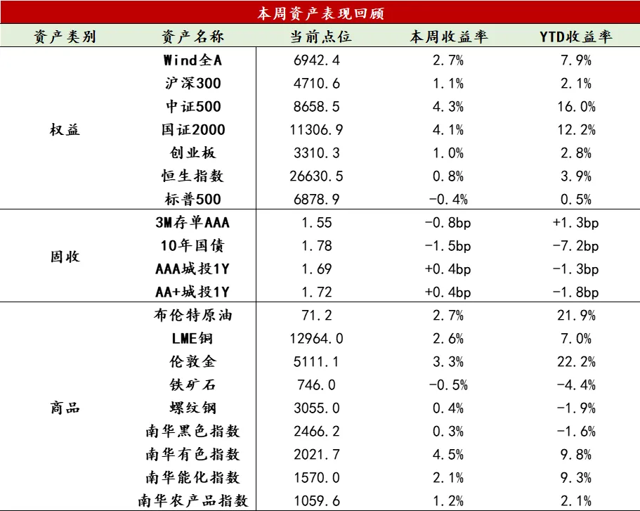 【股票】本周美国通胀数据超预期、中东地缘冲突升级,美股科技整体走弱,“HALO”类资产整体表现优于科技成长板块;A股市场是春节后首个交易周,资金回流、风险偏好抬升,整体放量上涨、全球表现领先,中盘风格显著占优、资源板块领涨。两市日均成交放量近3000亿至2.44万亿,76%的个股上涨,万得全A等权指数上涨3.38%。融资余额小幅增加至2.65万亿。主要宽基指数普涨,中证500、中证1000和中证2000实现较大涨幅,分别为4.32%、4.34%和3.94%。行业上,周期板块领涨、消费与部分科技板块回调。宏观不确定性、大宗商品价格回升及部分细分领域受细分领域AI基础设施需求支撑共同推动周期板块上涨,钢铁、有色、化工涨幅居前,其中钢铁、有色涨幅均在10%左右断层式领先;传媒、商贸零售、食品饮料等板块表现较弱。港股表现与美股更为贴近,恒生指数微涨0.82%,受宏观带来的流动性预期变化影响,恒生科技指数下跌1.41%。行业上,流动性更敏感的创新药大幅调整。资金面上,南向资金在周三周四恒生科技持续大跌后,周五入场抄底,当日净流入超130亿港元(科技和医药ETF大幅净流入),全周净流入约59亿元。AH溢价扩大至118以上。周末中东冲突升级并全面扩散,周中各类资产的价格已对此有所反应。若短期冲突演变为中长期混乱,预计对石化等周期品的利多偏中长期、对科技成长的利空仍偏短期,整体对A股市场慢牛格局的负面影响有限。短期科技板块调整提供加仓机会,但科技板块整体或难继续上行。近期港股科技板块持续回撤,主要系AI投资逻辑变动、互联网巨头和新势力车企盈利压力,以及日韩受益于基本面和政策支持、股价强势表现带来的资金虹吸等因素共振。短期来看,这些制约因素尚未看到转变迹象,市场情绪仍不乐观,建议等待右侧信号明确后再行布局。