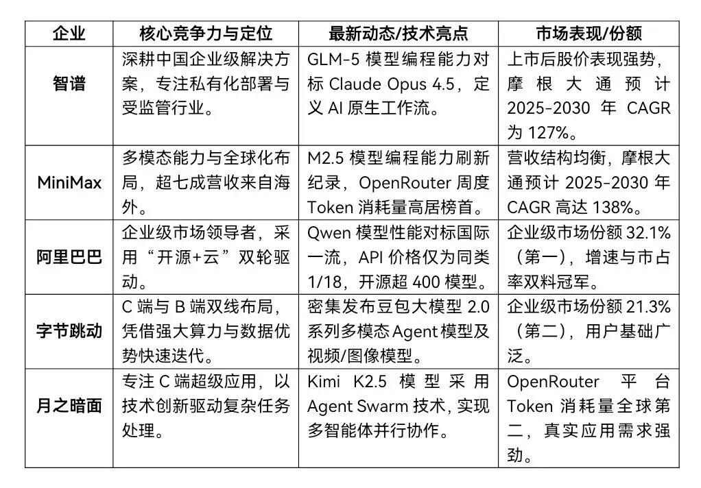 2026年初,国产大模型行业迎来历史性拐点。以智谱、MiniMax为代表的独立厂商在港交所上市后股价表现惊人,标志着国产模型正式进入“需求驱动”的正向循环。与此同时,阿里云千问在企业级市场份额中跃居首位,形成了独立创新与科技巨头全栈能力双轨并进的竞争格局。核心投资逻辑已从单纯的参数竞赛转向商业化落地能力、成本效益优势以及Agent生态构建的综合比拼。