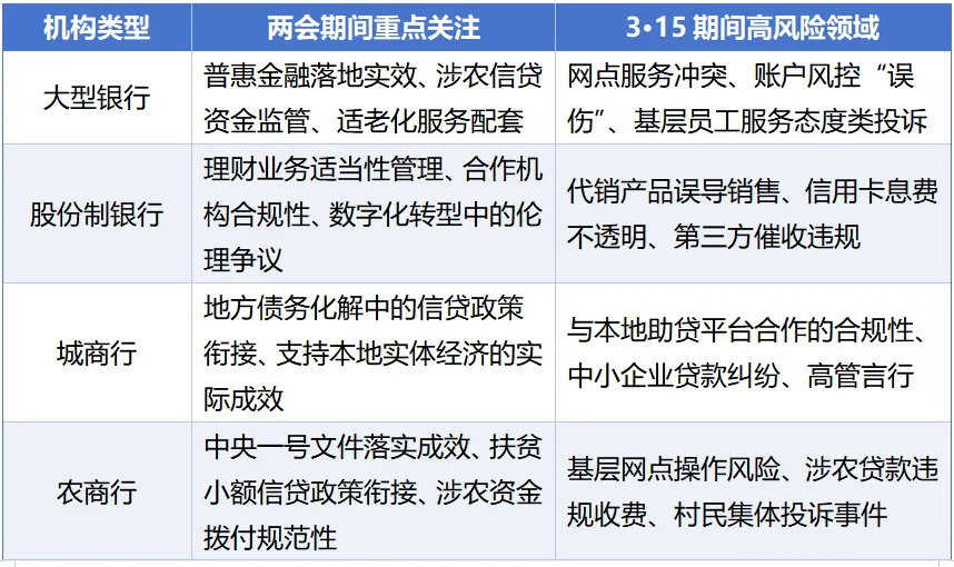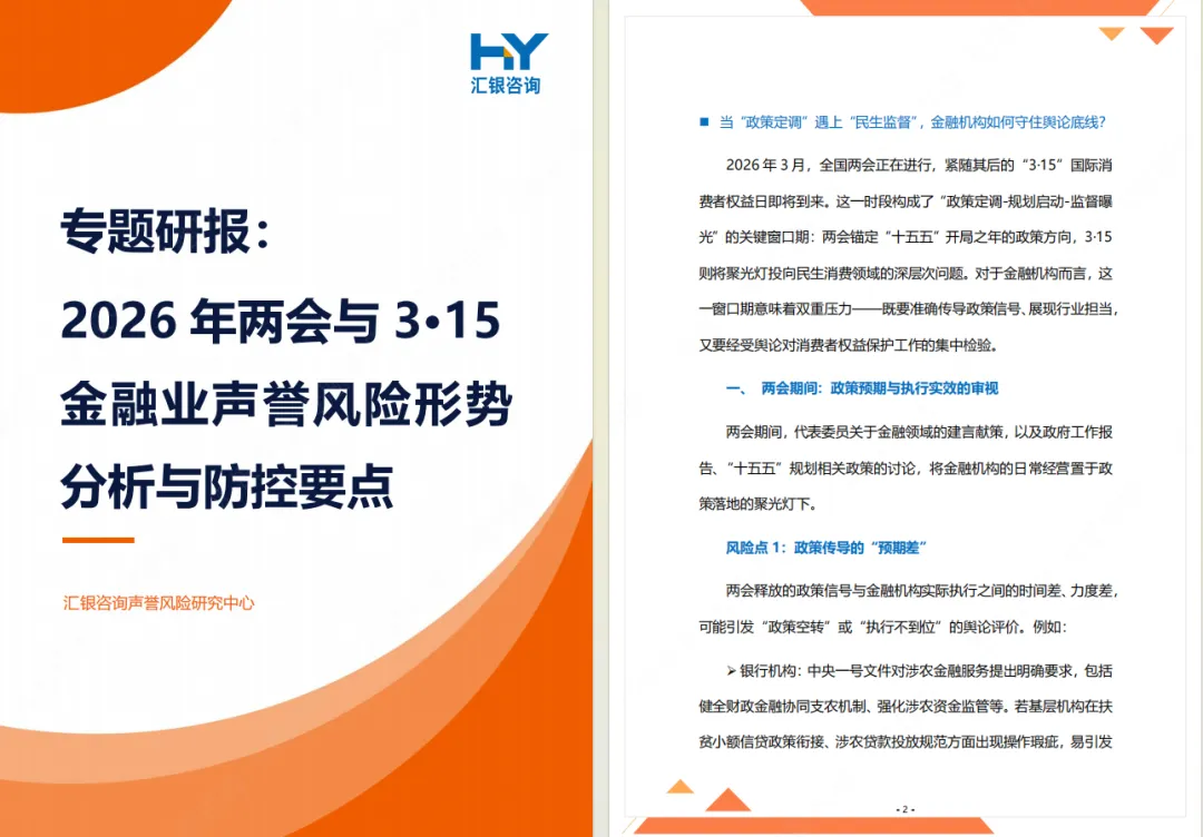 2026年3月,全国两会正在进行,紧随其后的“3·15”国际消费者权益日即将到来。这一时段构成了“政策定调-规划启动-监督曝光”的关键窗口期:两会锚定“十五五”开局之年的政策方向,3·15则将聚光灯投向民生消费领域的深层次问题。对于金融机构而言,这一窗口期意味着双重压力——既要准确传导政策信号、展现行业担当,又要经受舆论对消费者权益保护工作的集中检验。