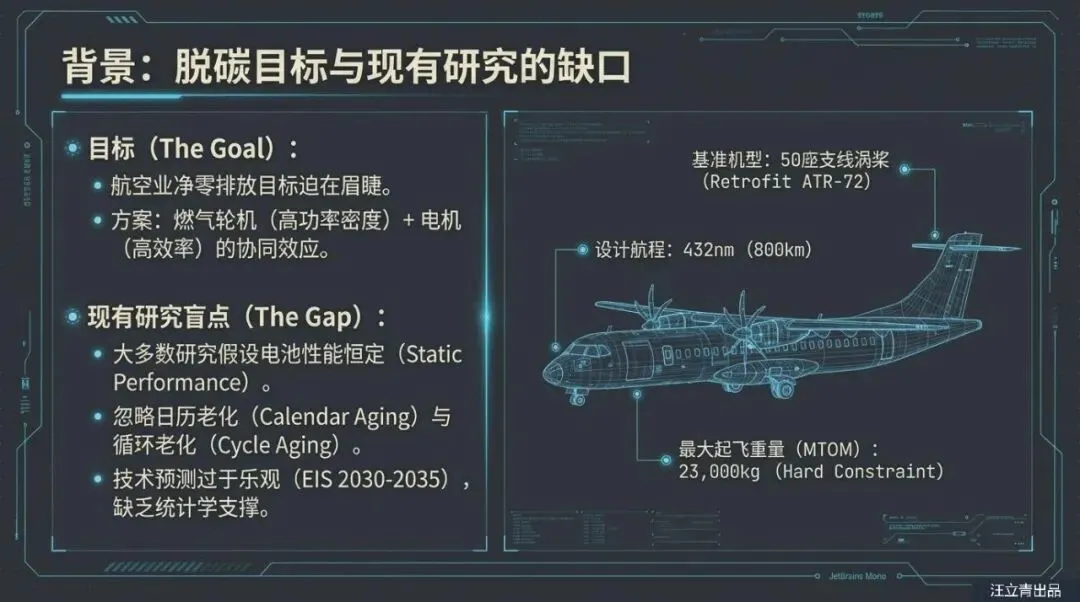 你是否也曾畅想过,未来的旅行将由安静、环保的电动飞机通过?各大航空展上那些酷炫的混合动力概念机似乎都在告诉我们:绿色航空时代就在眼前。然而,一项最新的航空研究给这股热潮泼了一盆冷水——或者说,是一剂清醒剂。这份基于ATR-72支线客机改装混合动力的深度报告揭示了一个残酷的现实:如果不解决电池的“衰老”和“死重”问题,哪怕到了2035年,我们可能也很难坐上真正省油又环保的混合动力飞机。目前市面上的研究往往过于乐观,甚至可以说是有些“画大饼”,它们假设电池技术会突飞猛进,却忽略了最致命的一点:电池是会变老的,而且它真的很重。